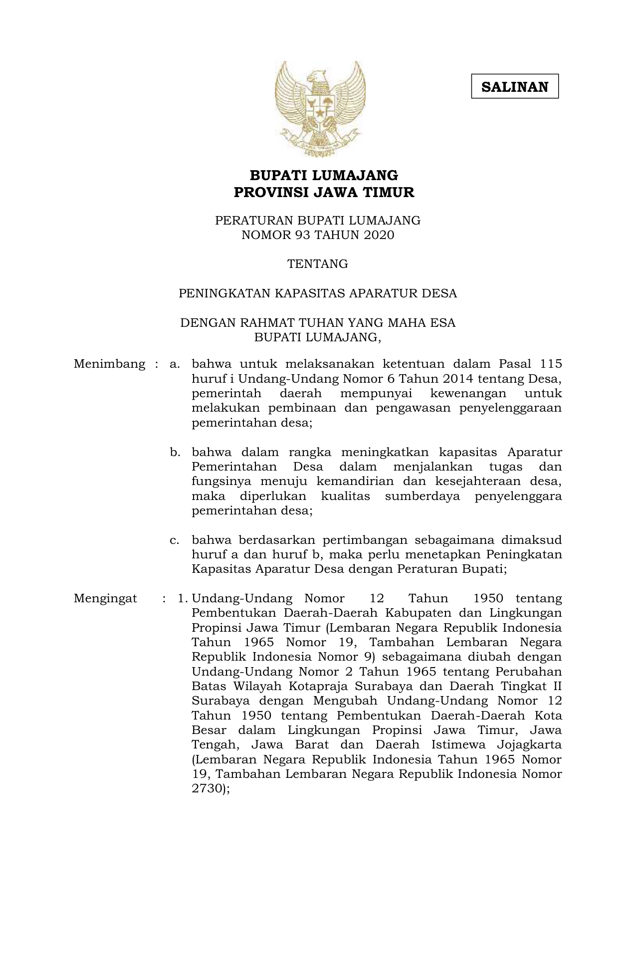 PERDA Nomor 93 Tahun 2020 | Peraturan Daerah Nomor 93 Tahun 2020 tentang PENINGKATAN KAPASITAS APARATUR DESA