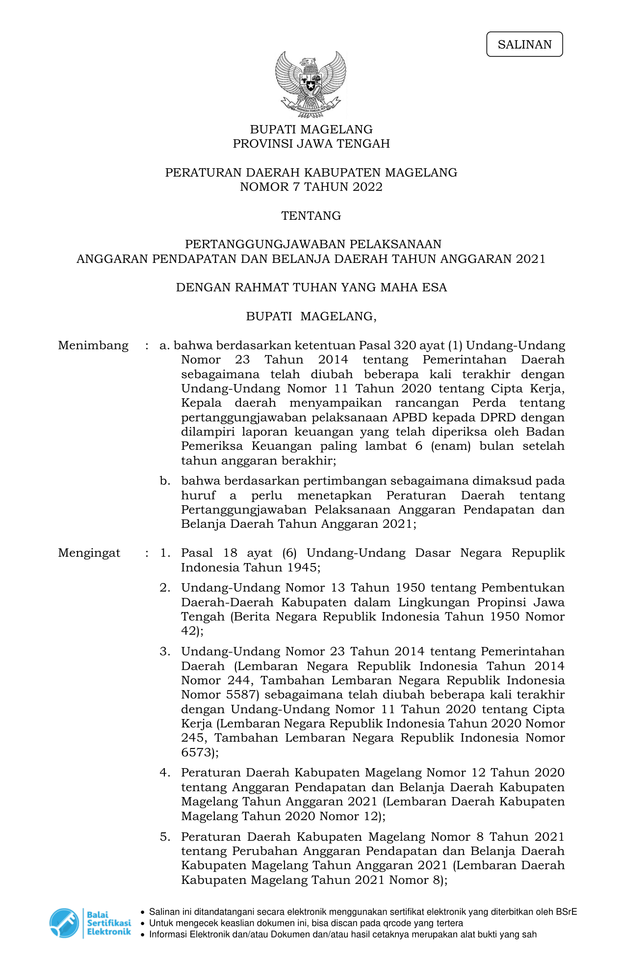 PERDA Nomor 7 Tahun 2022 | Peraturan Daerah Nomor 7 Tahun 2022 tentang PERTANGGUNGJAWABAN PELAKSANAANANGGARAN PENDAPATAN DAN BELANJA DAERAH TAHUN ANGGARAN 2021