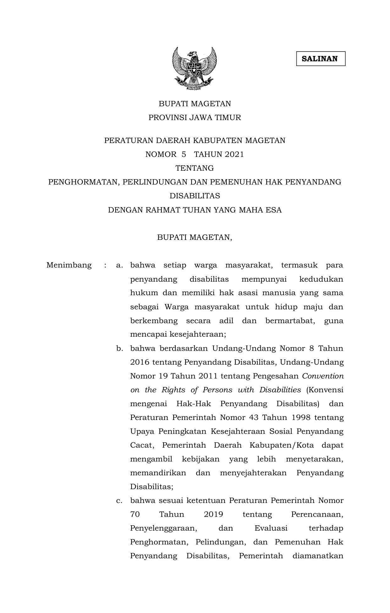 PERDA Nomor 5 Tahun 2021 | Peraturan Daerah Nomor 5 Tahun 2021 tentang Peraturan Daerah (PERDA) tentang Penghormatan, Perlindungan dan Pemenuhan Hak Penyandang Disabilitas
