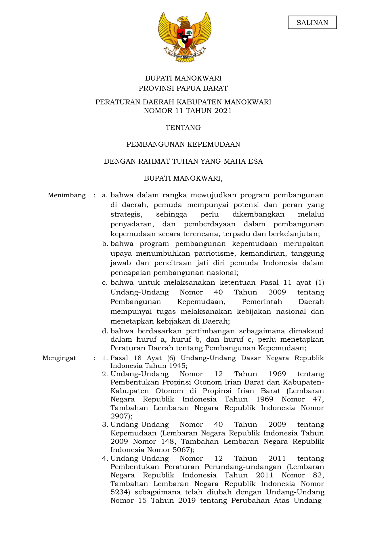 PERDA Nomor 11 Tahun 2021 | Peraturan Daerah Nomor 11 Tahun 2021 tentang PEMBANGUNAN KEPEMUDAAN