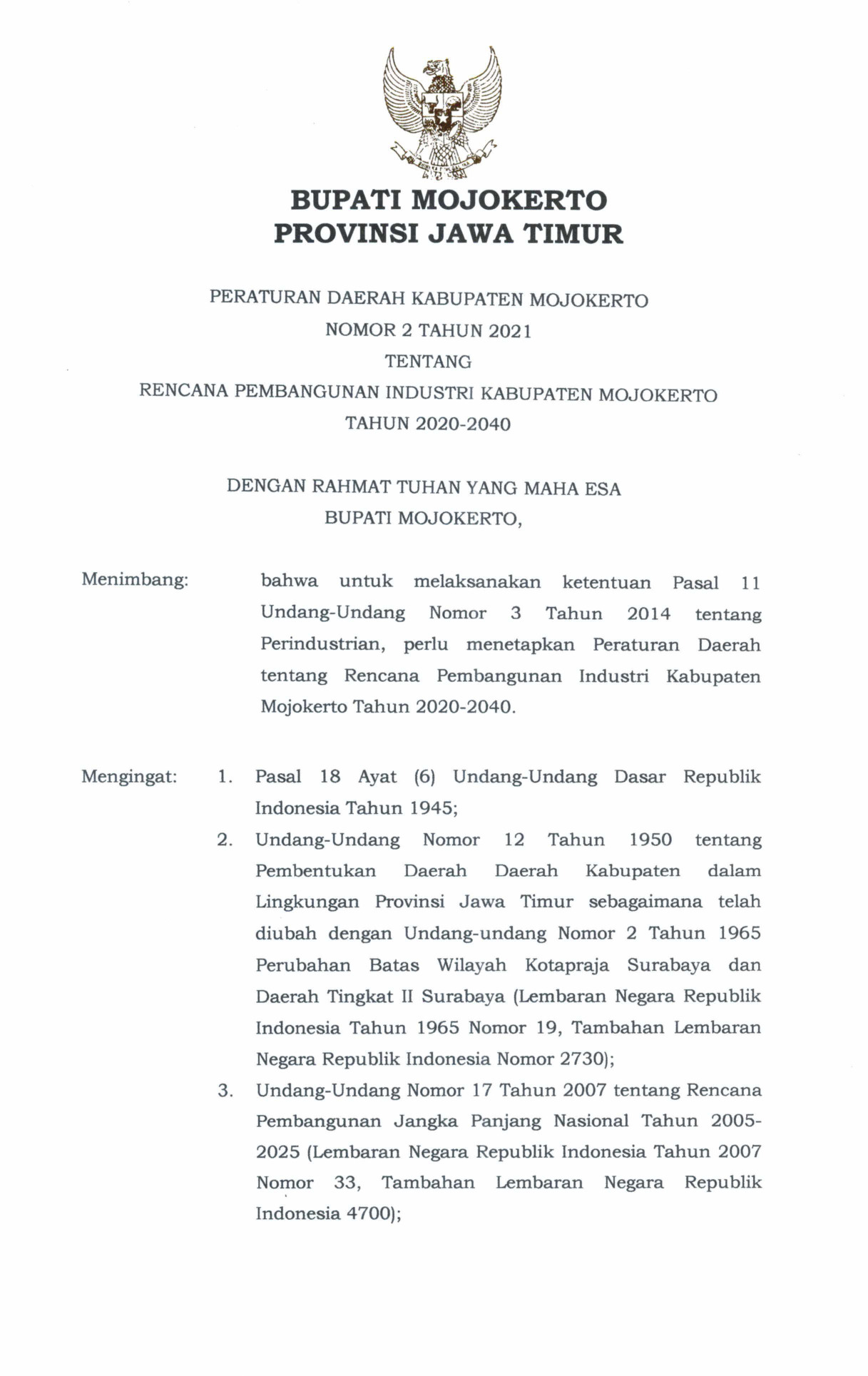 PERDA Nomor 2 Tahun 2021 | Peraturan Daerah Nomor 2 Tahun 2021 tentang RENCANA PEMBANGUNAN INDUSTRI KABUPATEN MOJOKERTO TAHUN 2020-2040