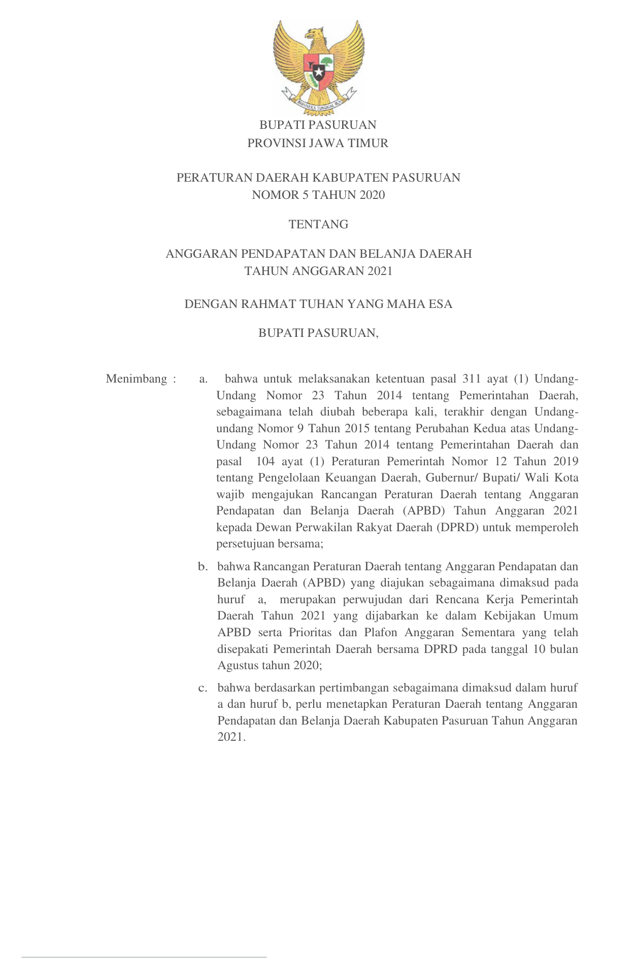 PERDA Nomor 5 Tahun 2020 | Peraturan Daerah Nomor 5 Tahun 2020 tentang ANGGARAN PENDAPATAN DAN BELANJA DAERAH TAHUN ANGGARAN 2021