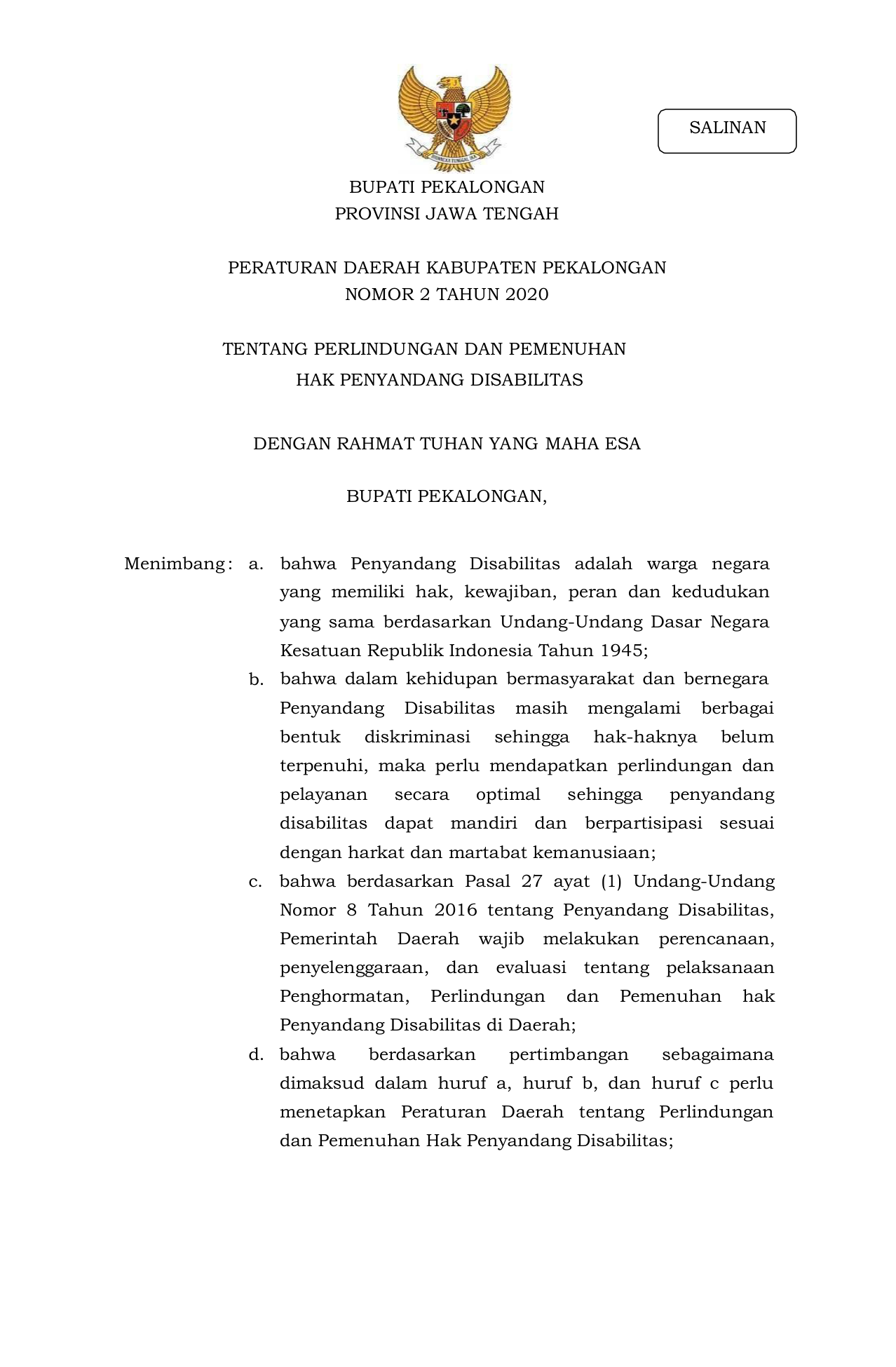 PERDA Nomor 2 Tahun 2020 | Peraturan Daerah Nomor 2 Tahun 2020 tentang TENTANG PERLINDUNGAN DAN PEMENUHAN HAK PENYANDANG DISABILITAS