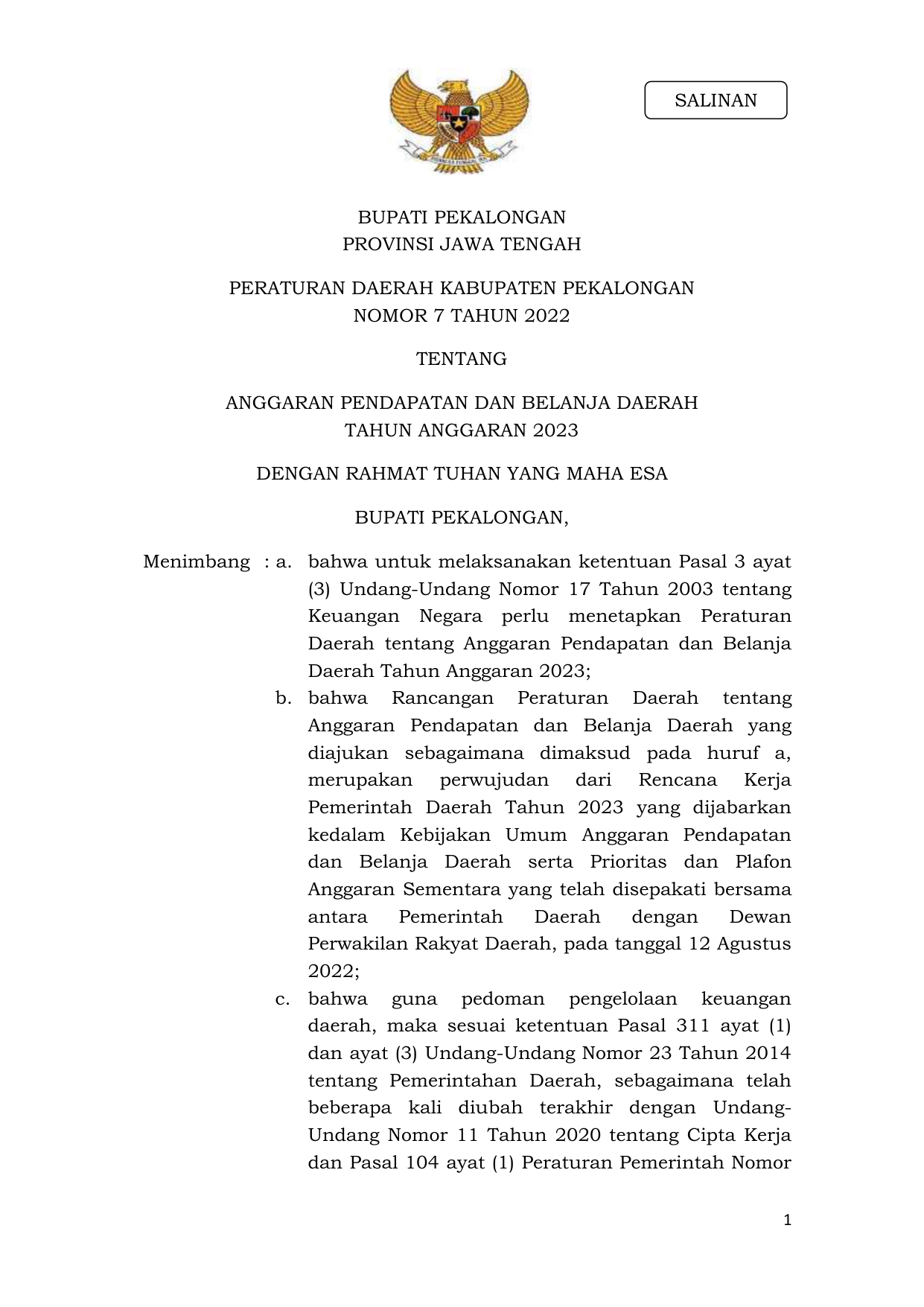 PERDA Nomor 7 Tahun 2022 | Peraturan Daerah Nomor 7 Tahun 2022 tentang ANGGARAN PENDAPATAN DAN BELANJA DAERAH TAHUN ANGGARAN 2023