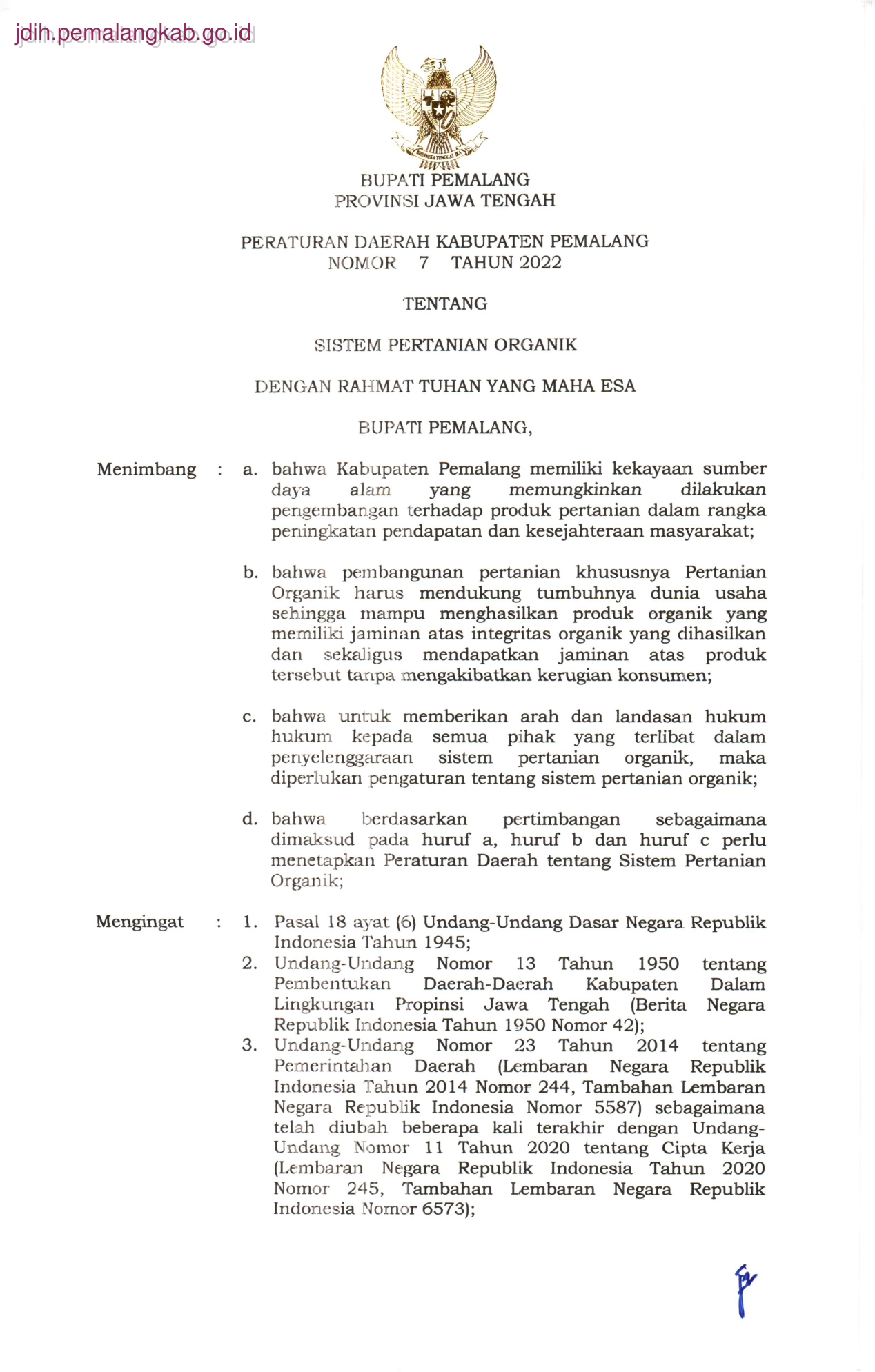 PERDA Nomor 7 Tahun 2022 | Peraturan Daerah Nomor 7 Tahun 2022 tentang SISTEM PERTANIAN ORGANIK