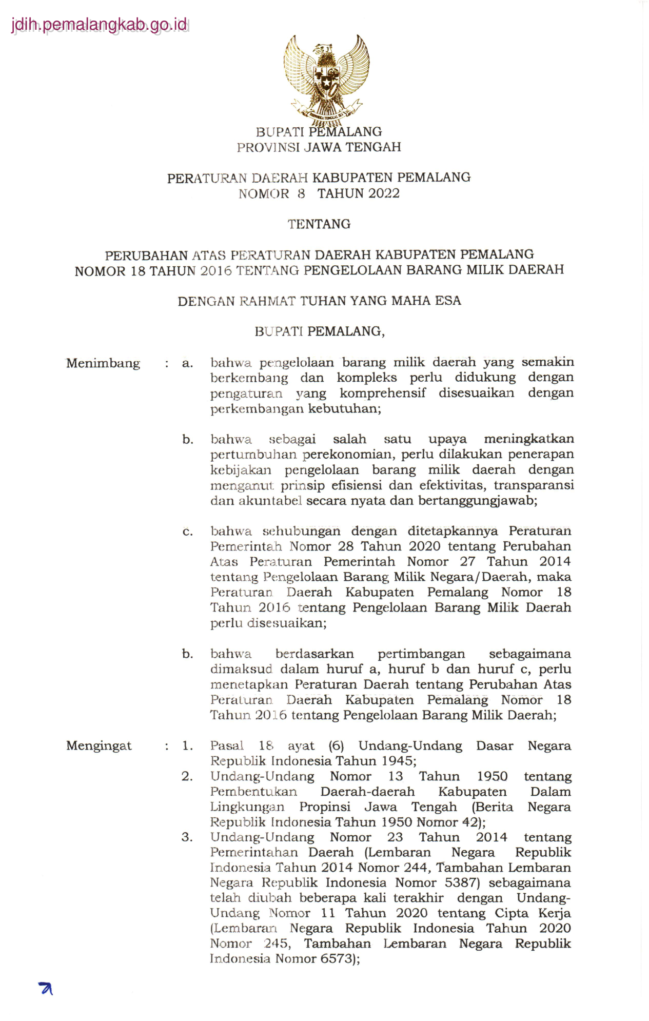PERDA Nomor 8 Tahun 2022 | Peraturan Daerah Nomor 8 Tahun 2022 tentang PERUBAHAN ATAS PERATURAN DAERAH KABUPATEN PEMALANGNOMOR 18 TAHUN 2016 TENTANG PENGELOLAAN BARANG MILIK DAERAH