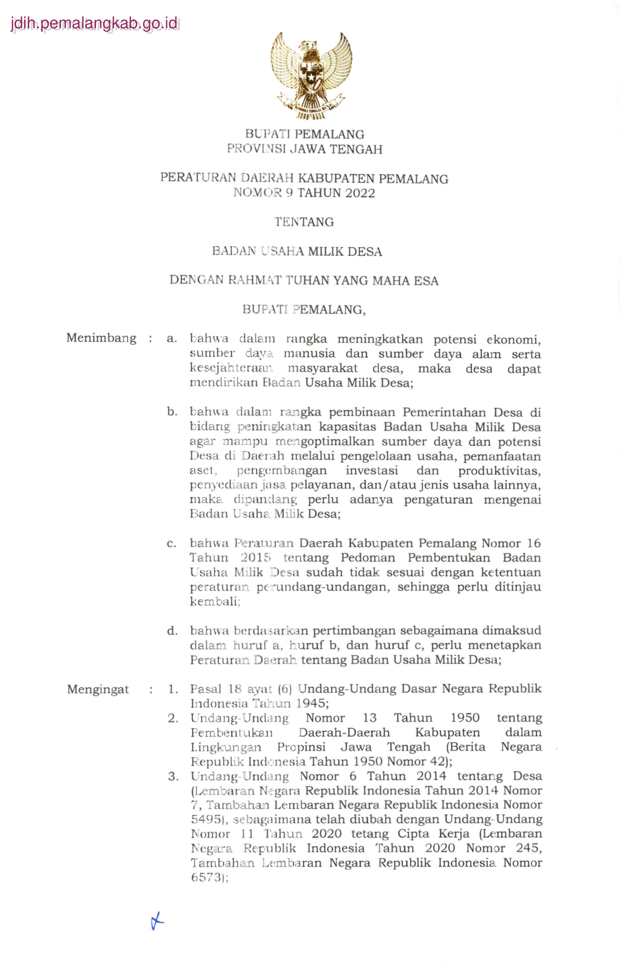 PERDA Nomor 9 Tahun 2022 | Peraturan Daerah Nomor 9 Tahun 2022 tentang BADAN USAHA MILIK DESA