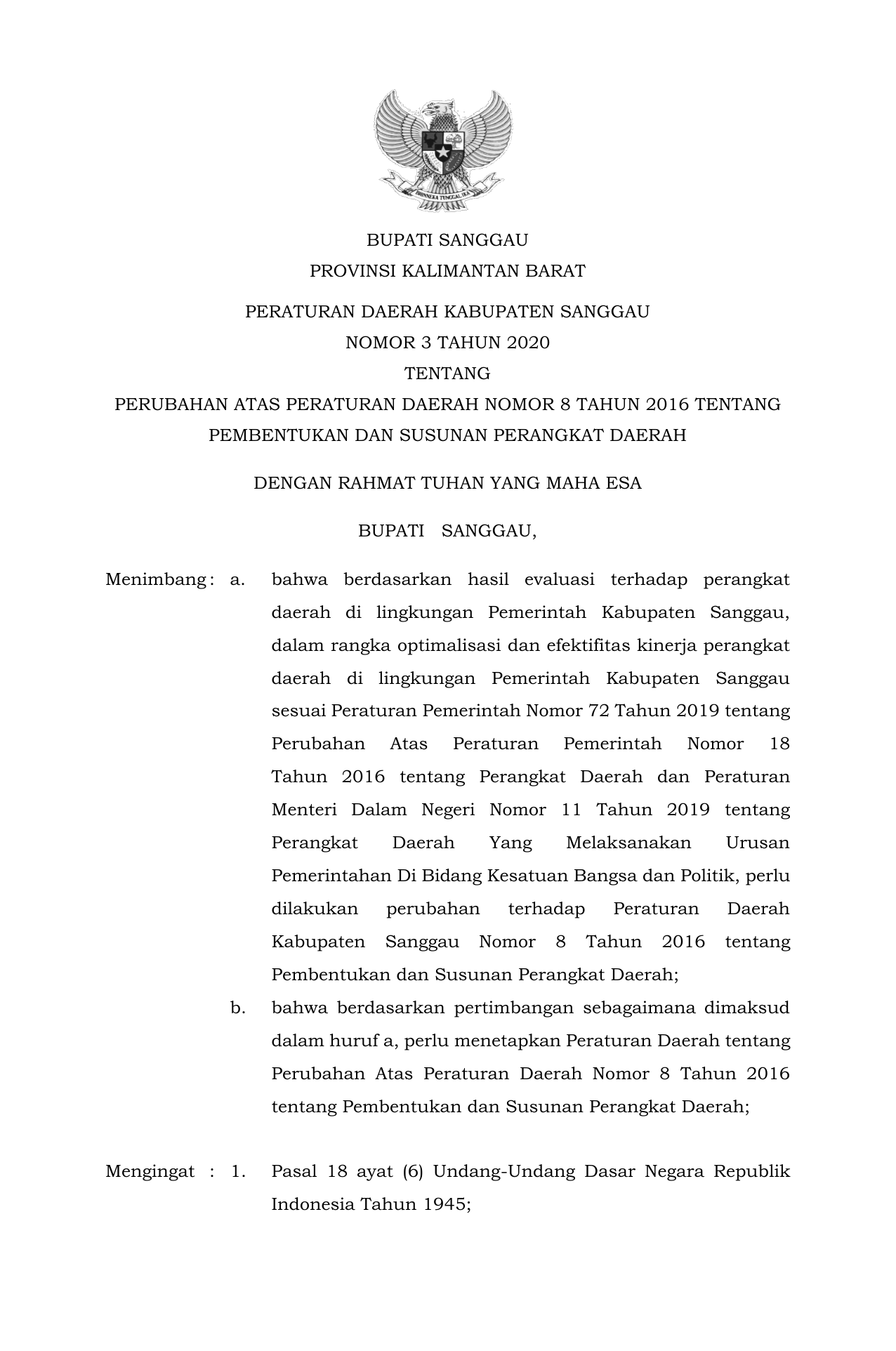 PERDA Nomor 3 Tahun 2020 | Peraturan Daerah Nomor 3 Tahun 2020 tentang PERUBAHAN ATAS PERATURAN DAERAH NOMOR 8 TAHUN 2016 TENTANG PEMBENTUKAN DAN SUSUNAN PERANGKAT DAERAH