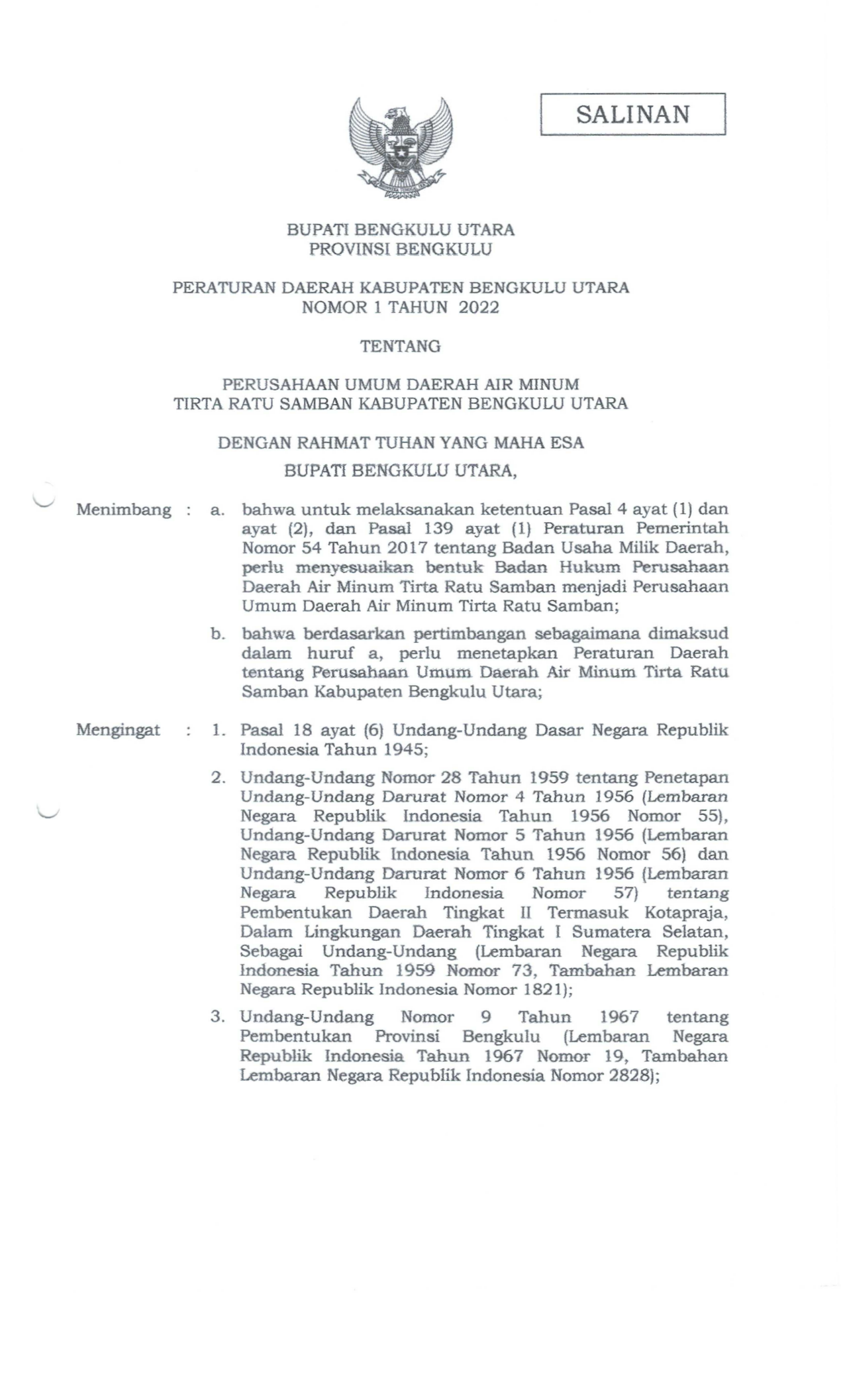PERDA Nomor 1 Tahun 2022 | Peraturan Daerah Nomor 1 Tahun 2022 tentang Perusahaan Umum Daerah Air Minum Tirta Ratu Samban Kabupaten Bengkulu Utar