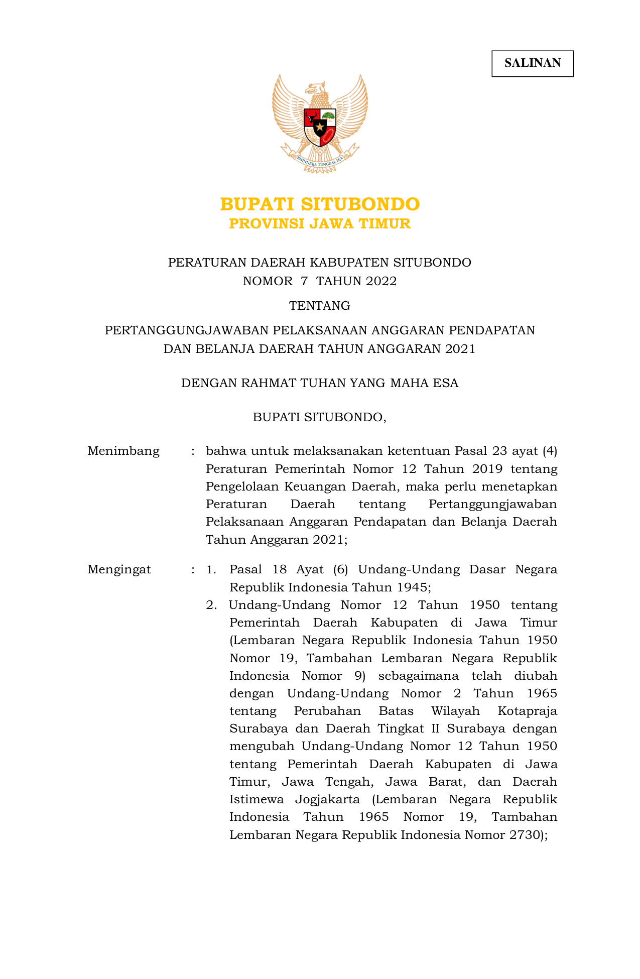 PERDA Nomor 7 Tahun 2022 | Peraturan Daerah Nomor 7 Tahun 2022 tentang PERTANGGUNGJAWABAN PELAKSANAAN ANGGARAN PENDAPATAN DAN BELANJA DAERAH TAHUN ANGGARAN 2021