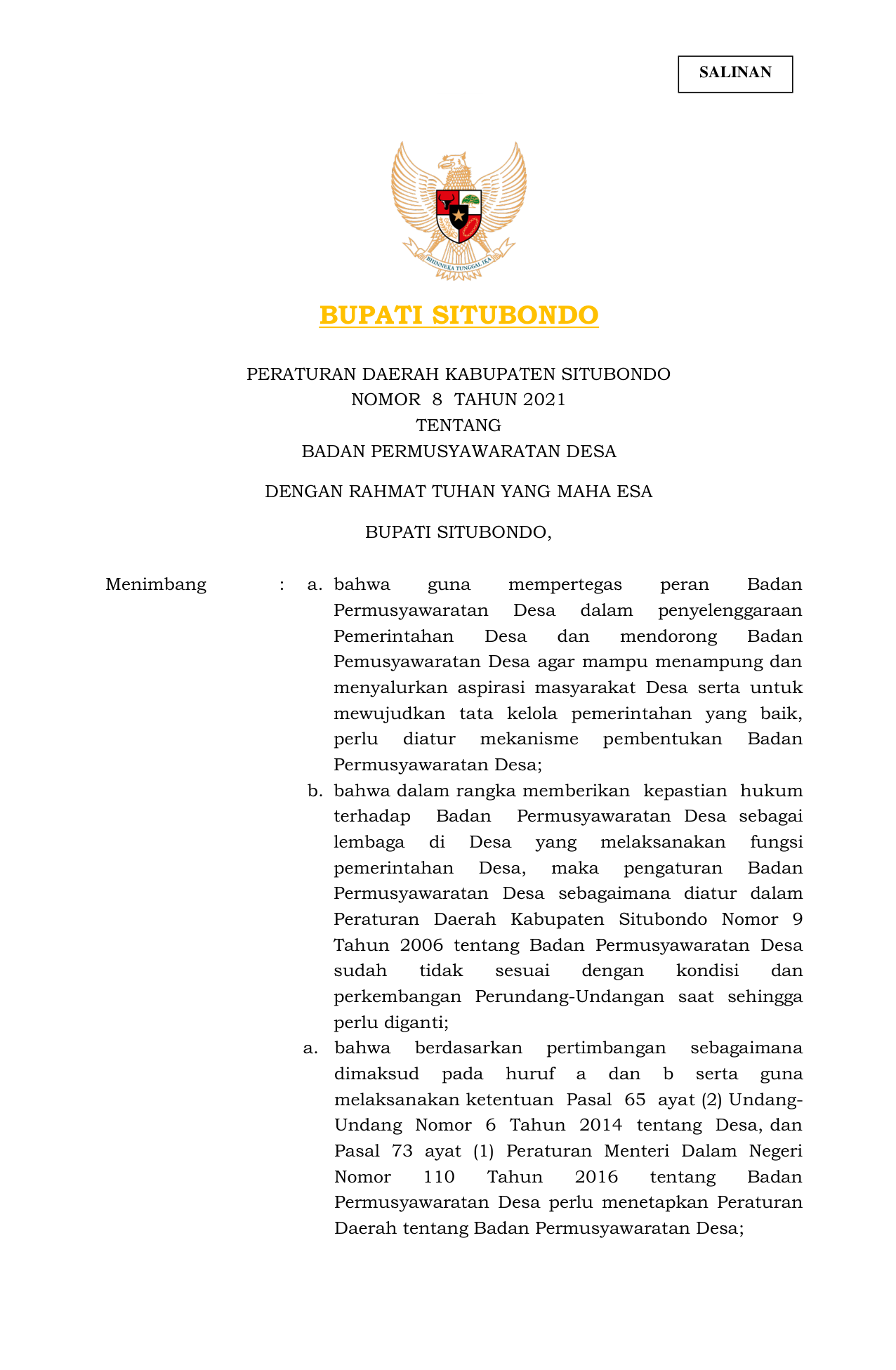 PERDA Nomor 8 Tahun 2021 | Peraturan Daerah Nomor 8 Tahun 2021 tentang BADAN PERMUSYAWARATAN DESA
