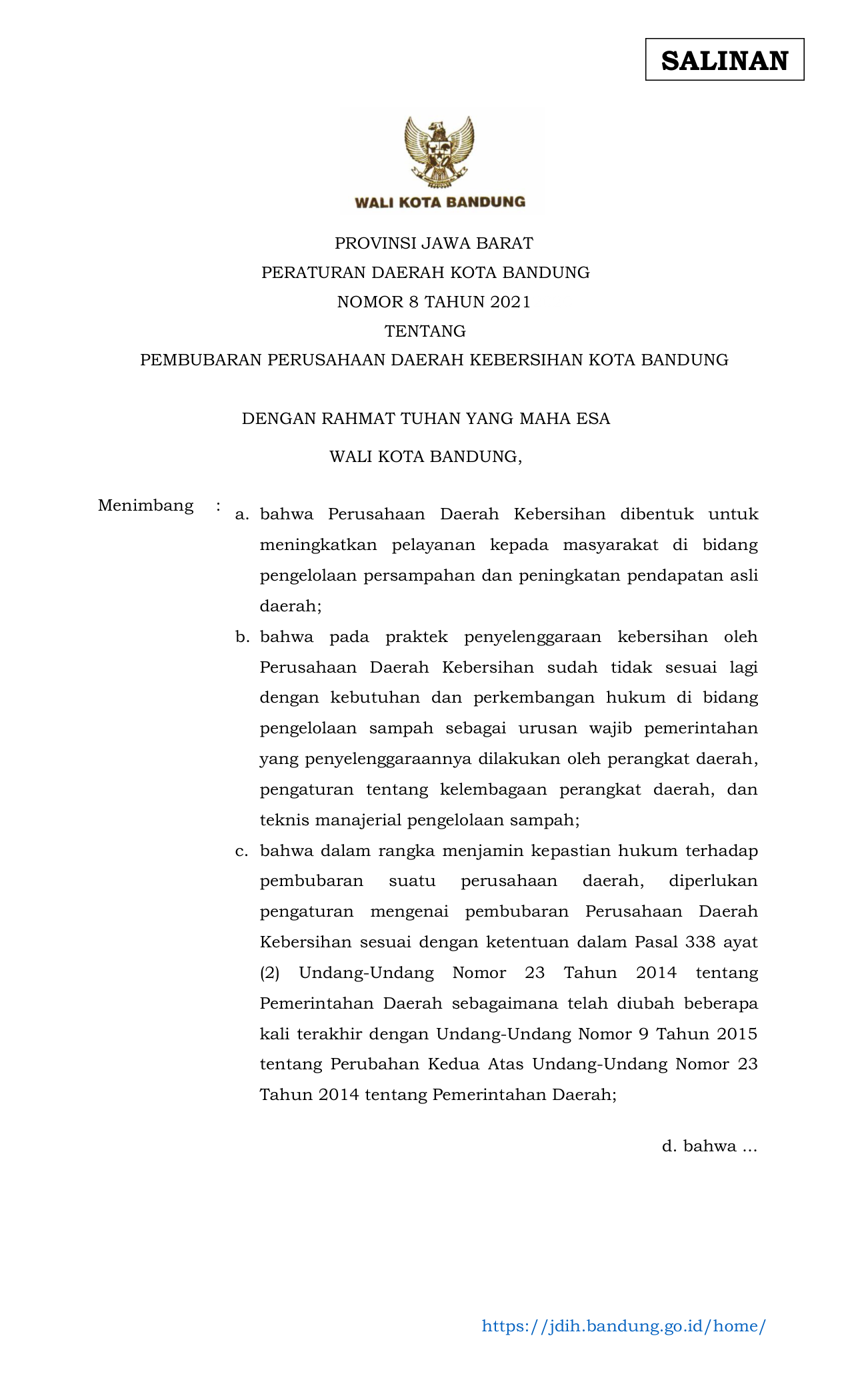 PERDA Nomor 8 Tahun 2021 | Peraturan Daerah Nomor 8 Tahun 2021 tentang Pembubaran Perusahaan Daerah Kebersihan Kota Bandung