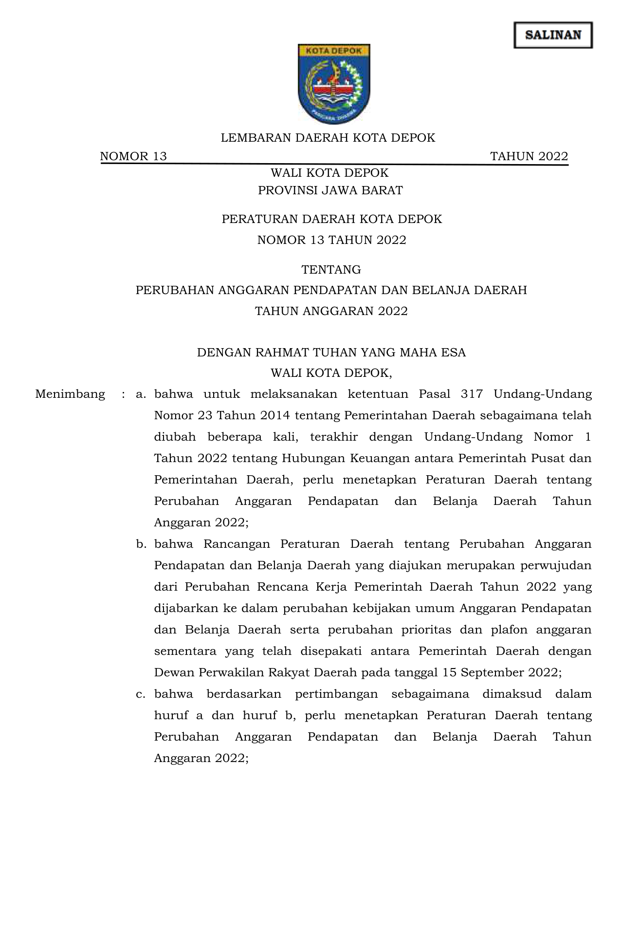 PERDA Nomor 13 Tahun 2022 | Peraturan Daerah Nomor 13 Tahun 2022 tentang PERUBAHAN ANGGARAN PENDAPATAN DAN BELANJA DAERAH TAHUN ANGGARAN 2022