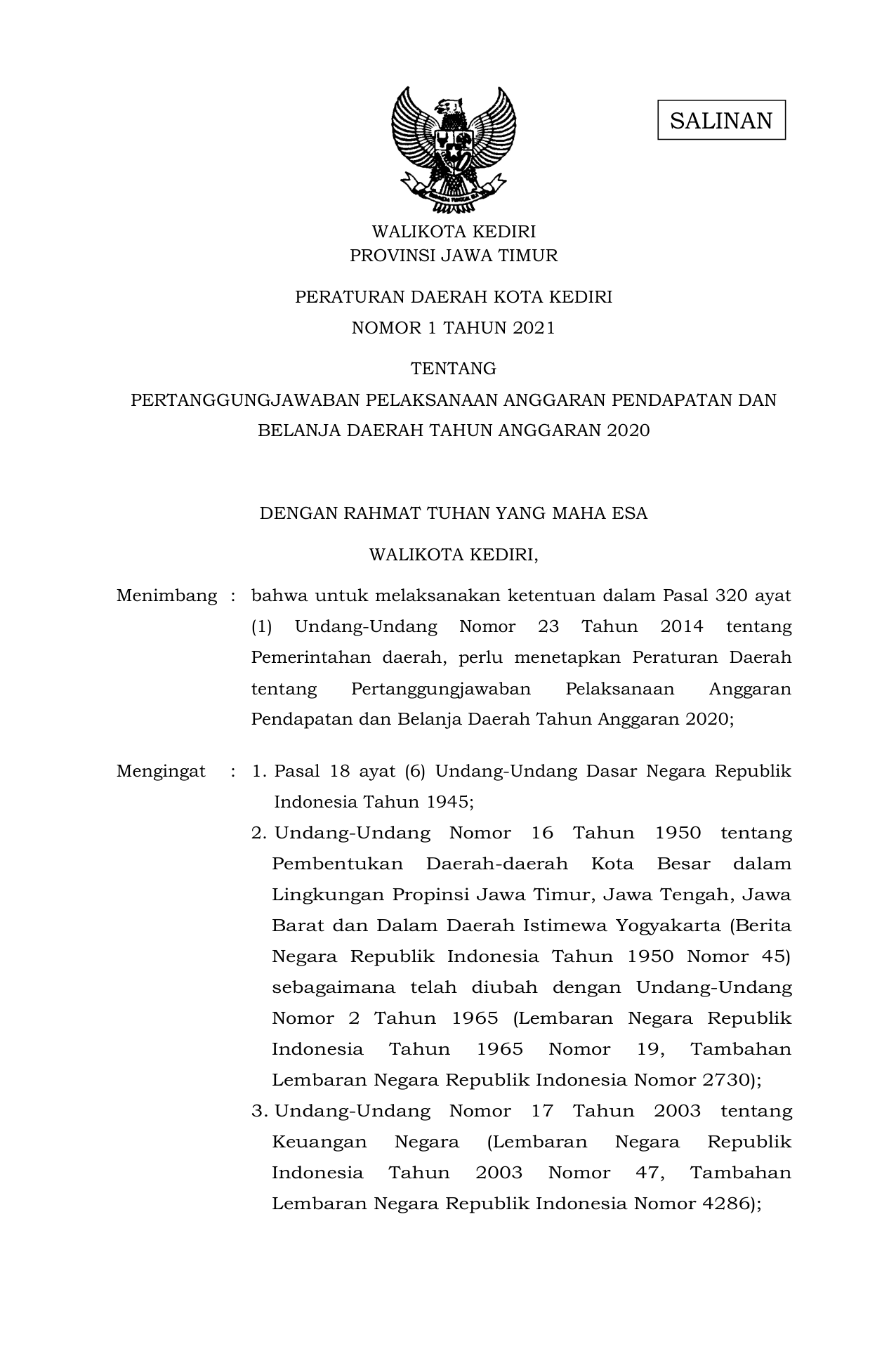PERDA Nomor 1 Tahun 2021 | Peraturan Daerah Nomor 1 Tahun 2021 tentang PERTANGGUNGJAWABAN PELAKSANAAN ANGGARAN PENDAPATAN DAN BELANJA DAERAH TAHUN ANGGARAN 2020