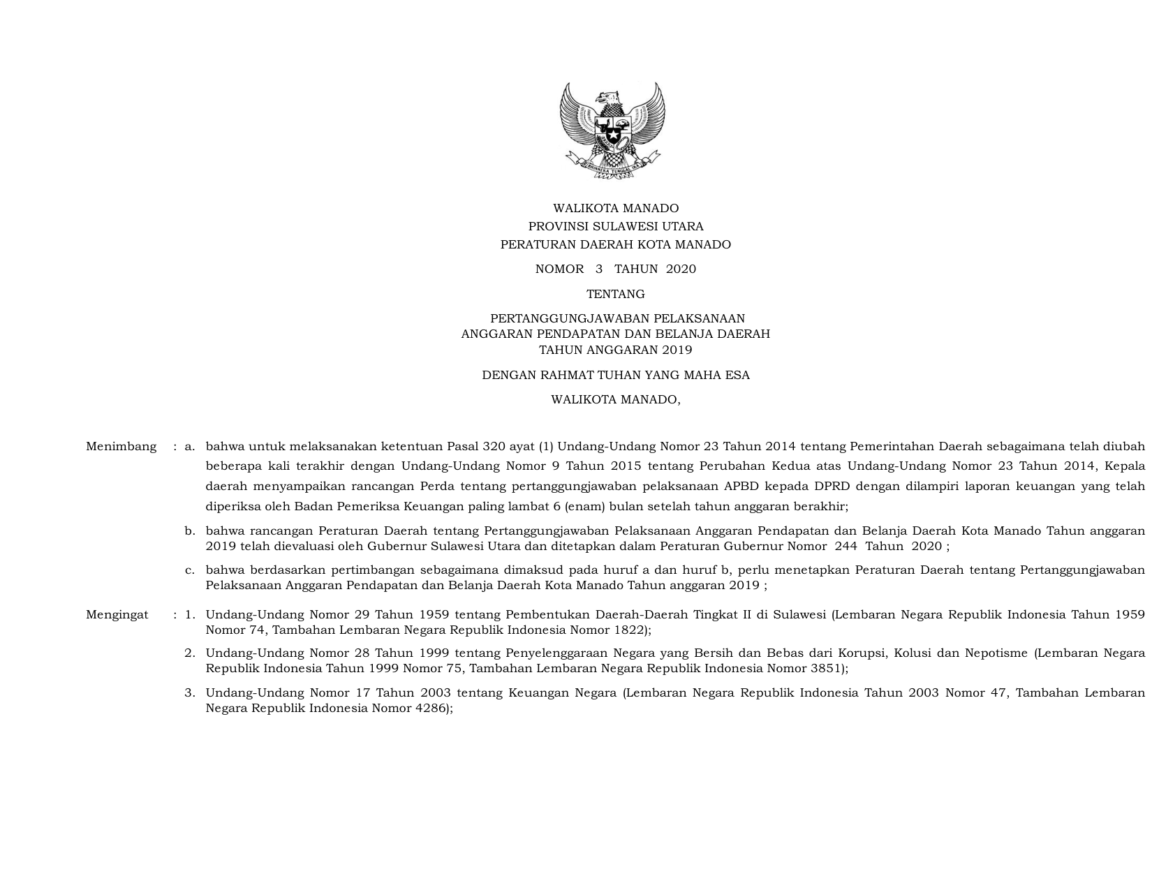 PERDA Nomor 3 Tahun 2020 | Peraturan Daerah Nomor 3 Tahun 2020 tentang Pertanggungjawaban Pelaksanaan Anggaran Pendapatan Dan Belanja Daerah Tahun Anggaran 2019