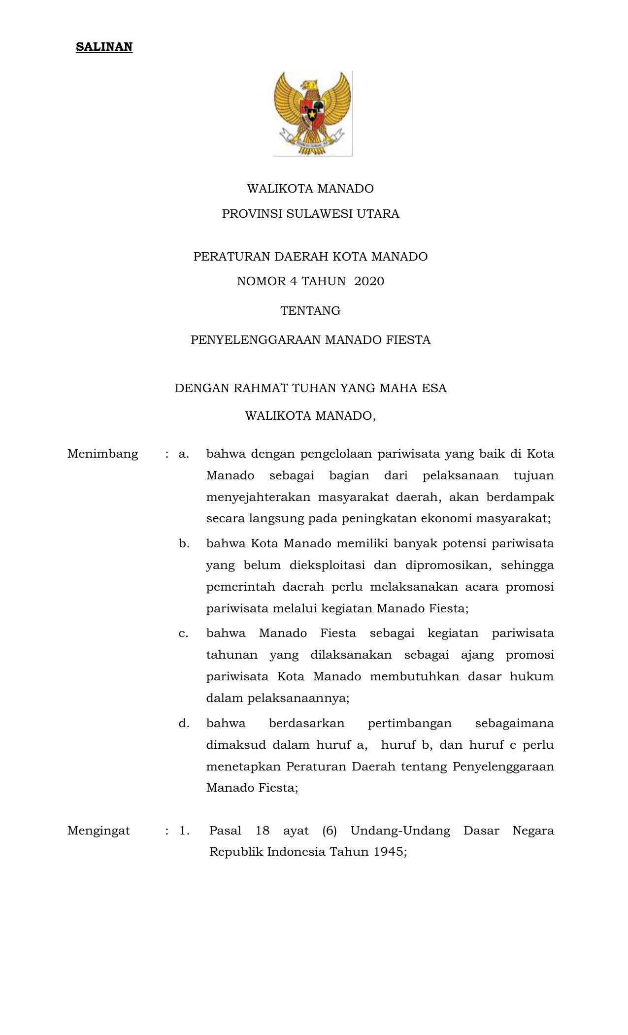 PERDA Nomor 4 Tahun 2020 | Peraturan Daerah Nomor 4 Tahun 2020 tentang Penyelenggaraan Manado Fiesta