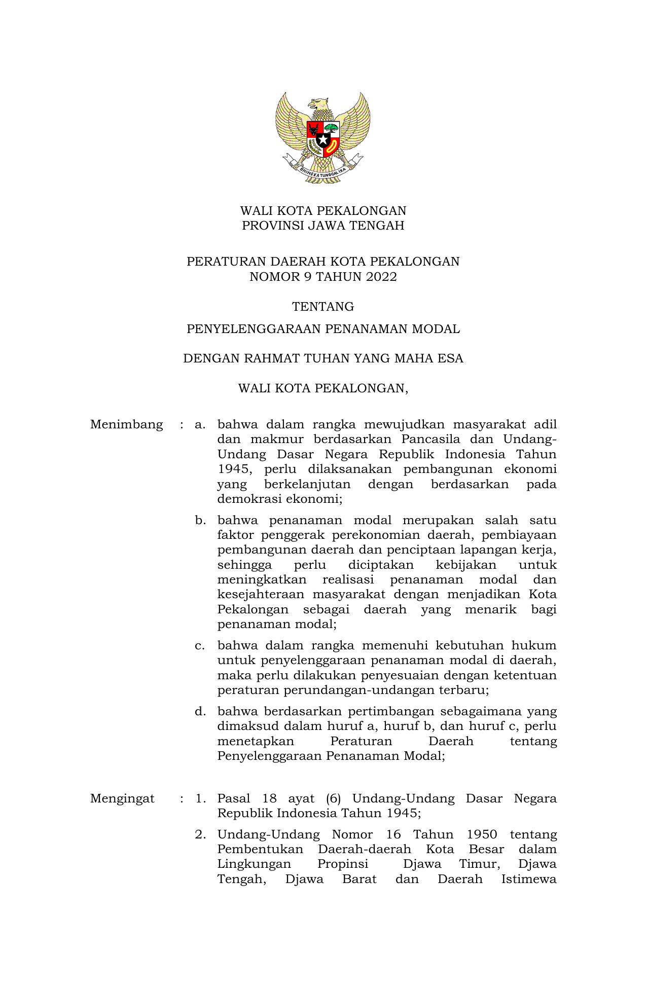 PERDA Nomor 9 Tahun 2022 | Peraturan Daerah Nomor 9 Tahun 2022 tentang PENYELENGGARAAN PENANAMAN MODAL