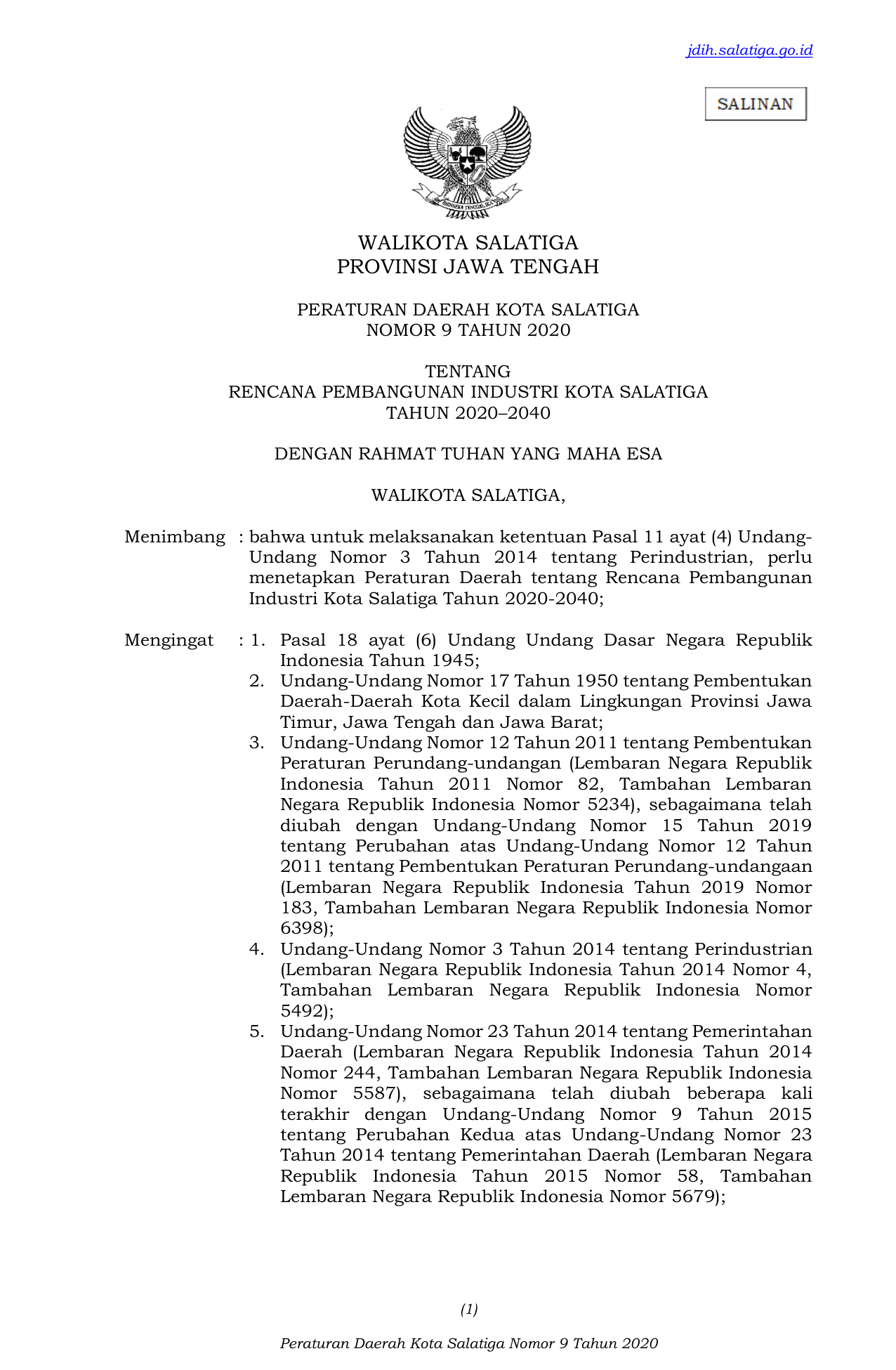 PERDA Nomor 9 Tahun 2020 | Peraturan Daerah Nomor 9 Tahun 2020 tentang Peraturan Daerah NOMOR 9 TAHUN 2020 TENTANG Rencana Pembangunan Industri Kota Salatiga Tahun 2020 2040
