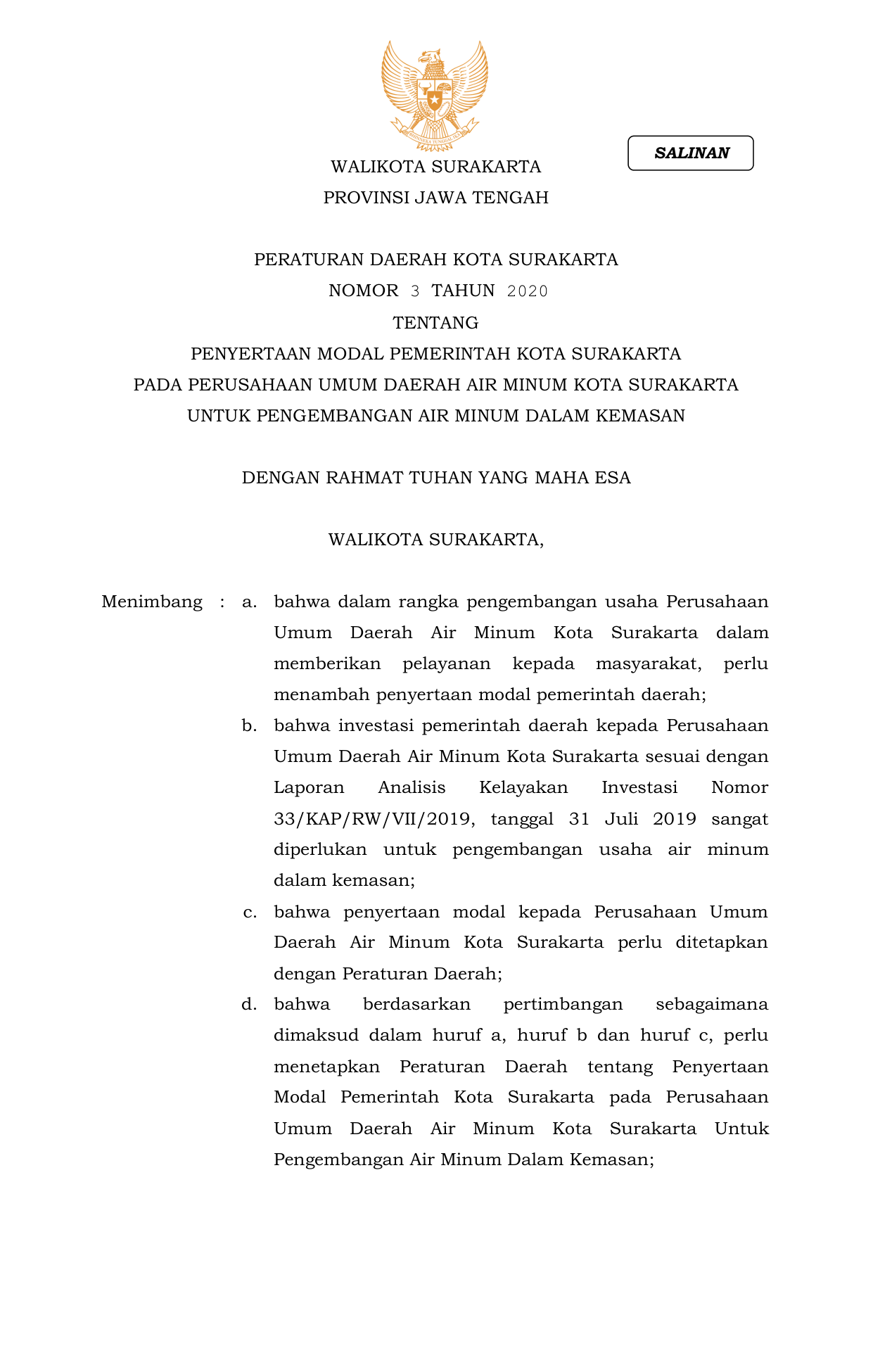 PERDA Nomor 3 Tahun 2020 | Peraturan Daerah Nomor 3 Tahun 2020 tentang PENYERTAAN MODAL PEMERINTAH KOTA SURAKARTAPADA PERUSAHAAN UMUM DAERAH AIR MINUM KOTA SURAKARTAUNTUK PENGEMBANGAN AIR MINUM DALAM KEMASAN