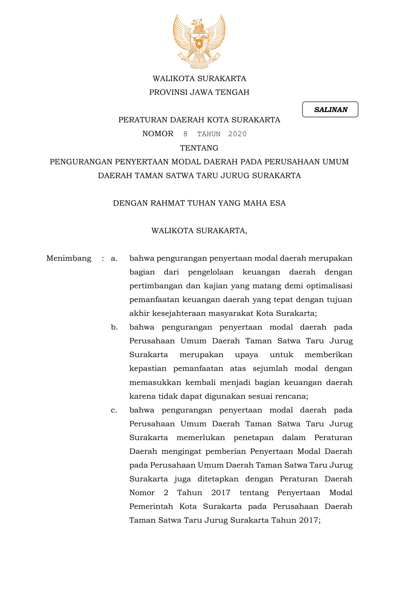 PERDA Nomor 8 Tahun 2020 | Peraturan Daerah Nomor 8 Tahun 2020 tentang PENGURANGAN PENYERTAAN MODAL DAERAH PADA PERUSAHAAN UMUMDAERAH TAMAN SATWA TARU JURUG SURAKARTA
