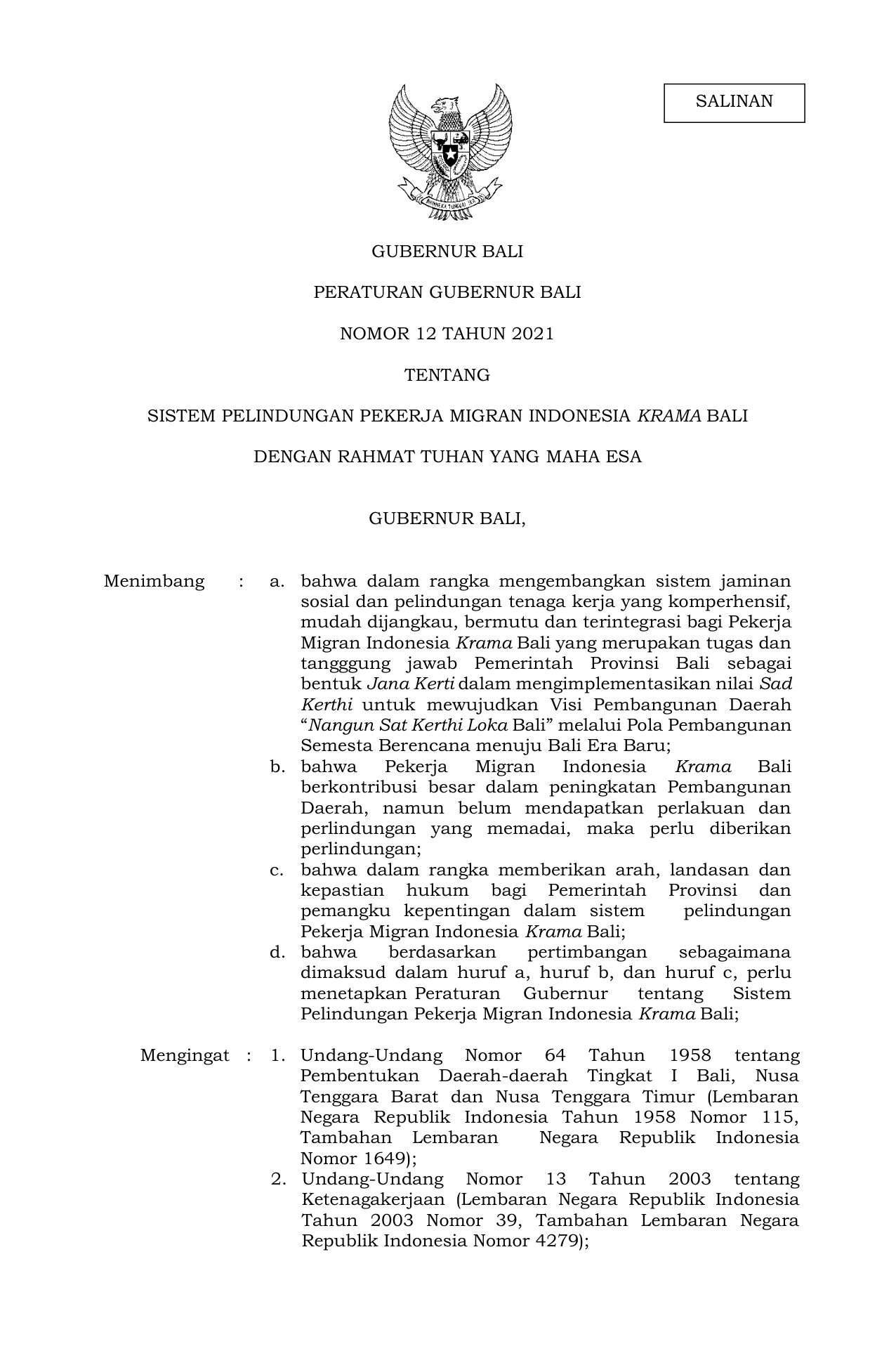 PERDA Nomor 12 Tahun 2021 | Peraturan Daerah Nomor 12 Tahun 2021 tentang Peraturan Gubernur Bali Nomor 12 Tahun 2021 tentang Sistem Pelindungan Pekerja Migran Indonesia Krama Bali
