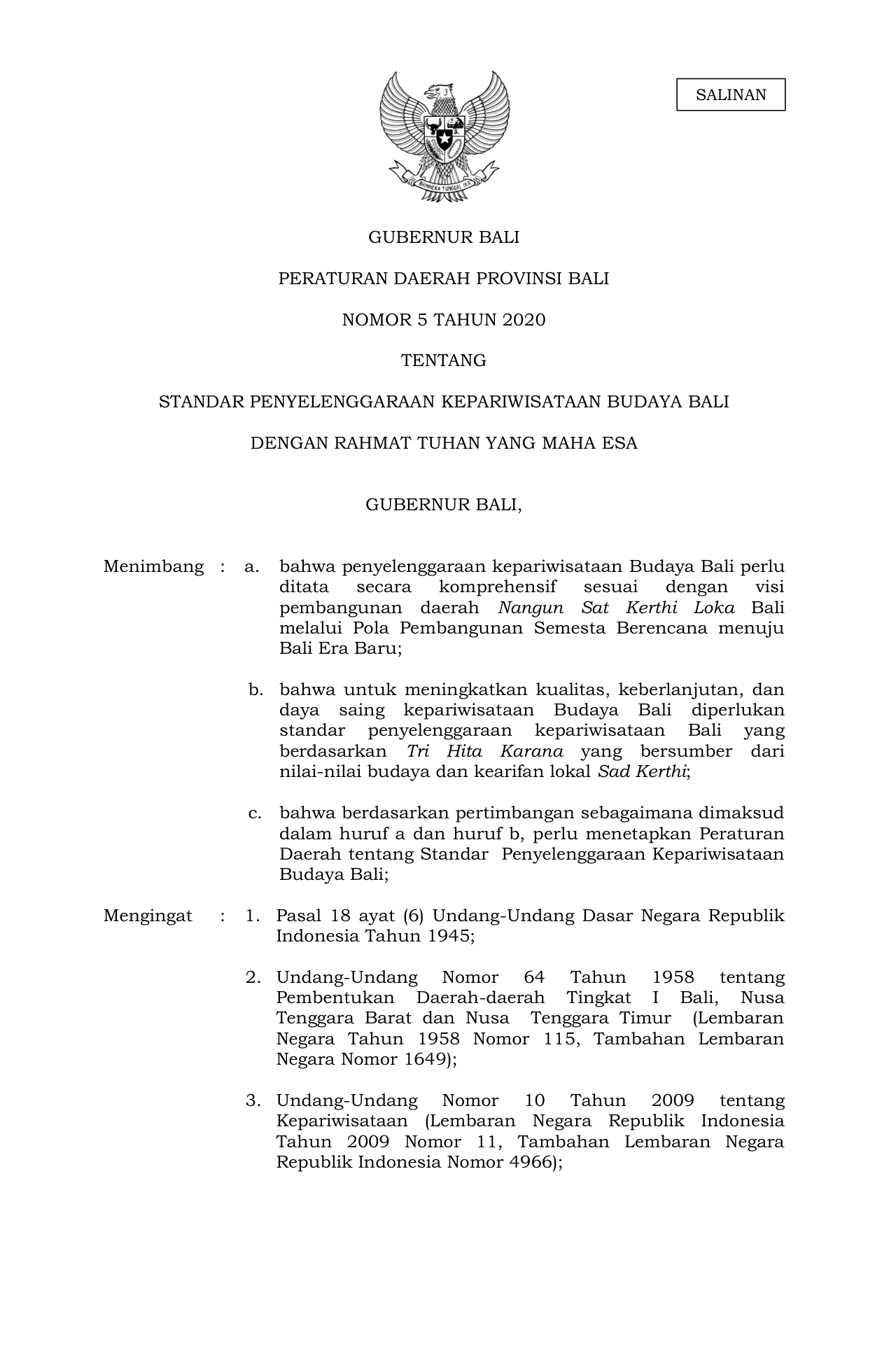 PERDA Nomor 5 Tahun 2020 | Peraturan Daerah Nomor 5 Tahun 2020 tentang Peraturan Daerah Provinsi Bali Nomor 5 Tahun 2020 tentang Standar Penyelenggaraan Kepariwisataan Budaya Bali
