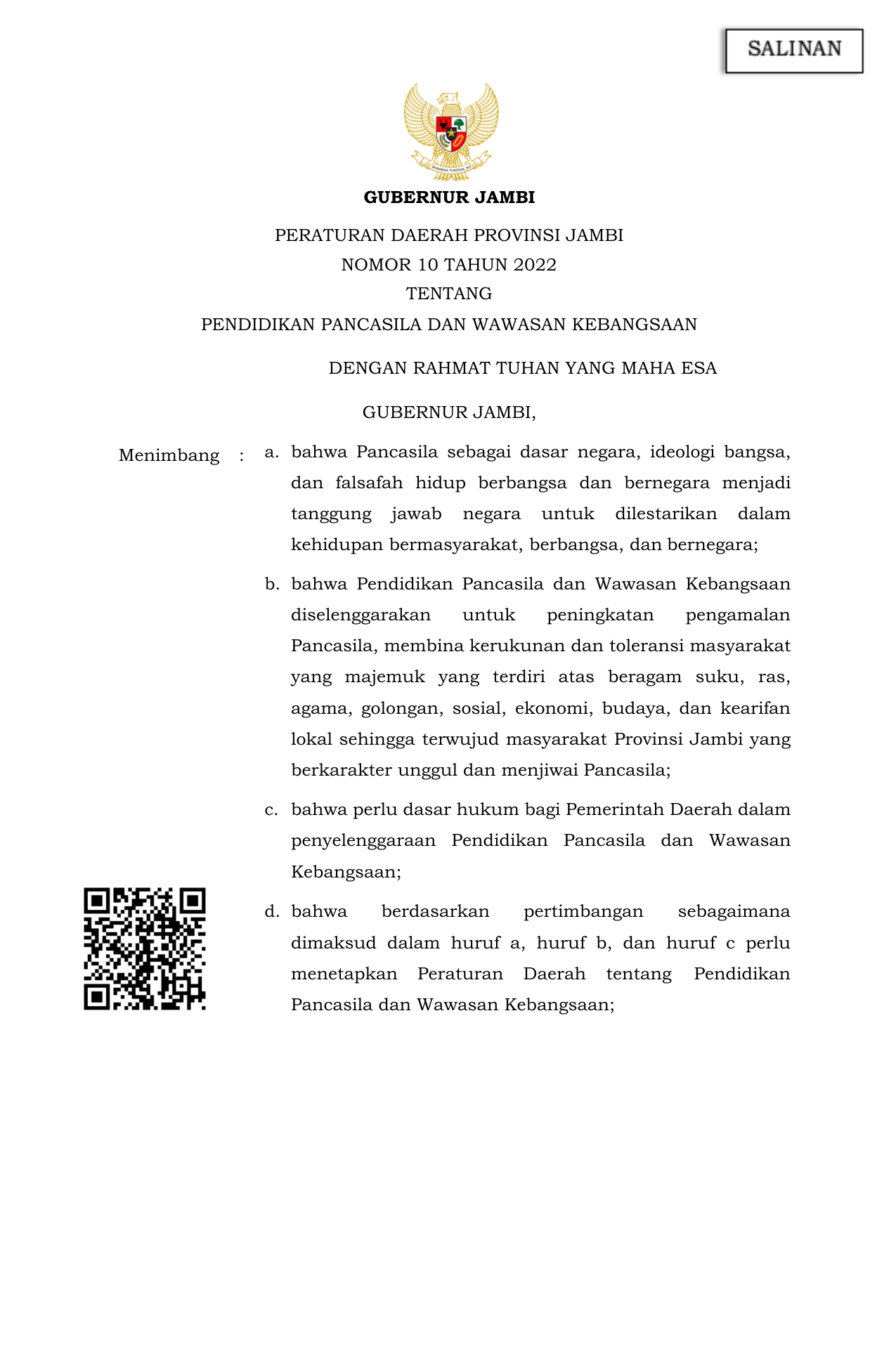 PERDA Nomor 10 Tahun 2022 | Peraturan Daerah Nomor 10 Tahun 2022 tentang PENDIDIKAN PANCASILA DAN WAWASAN KEBANGSAAN