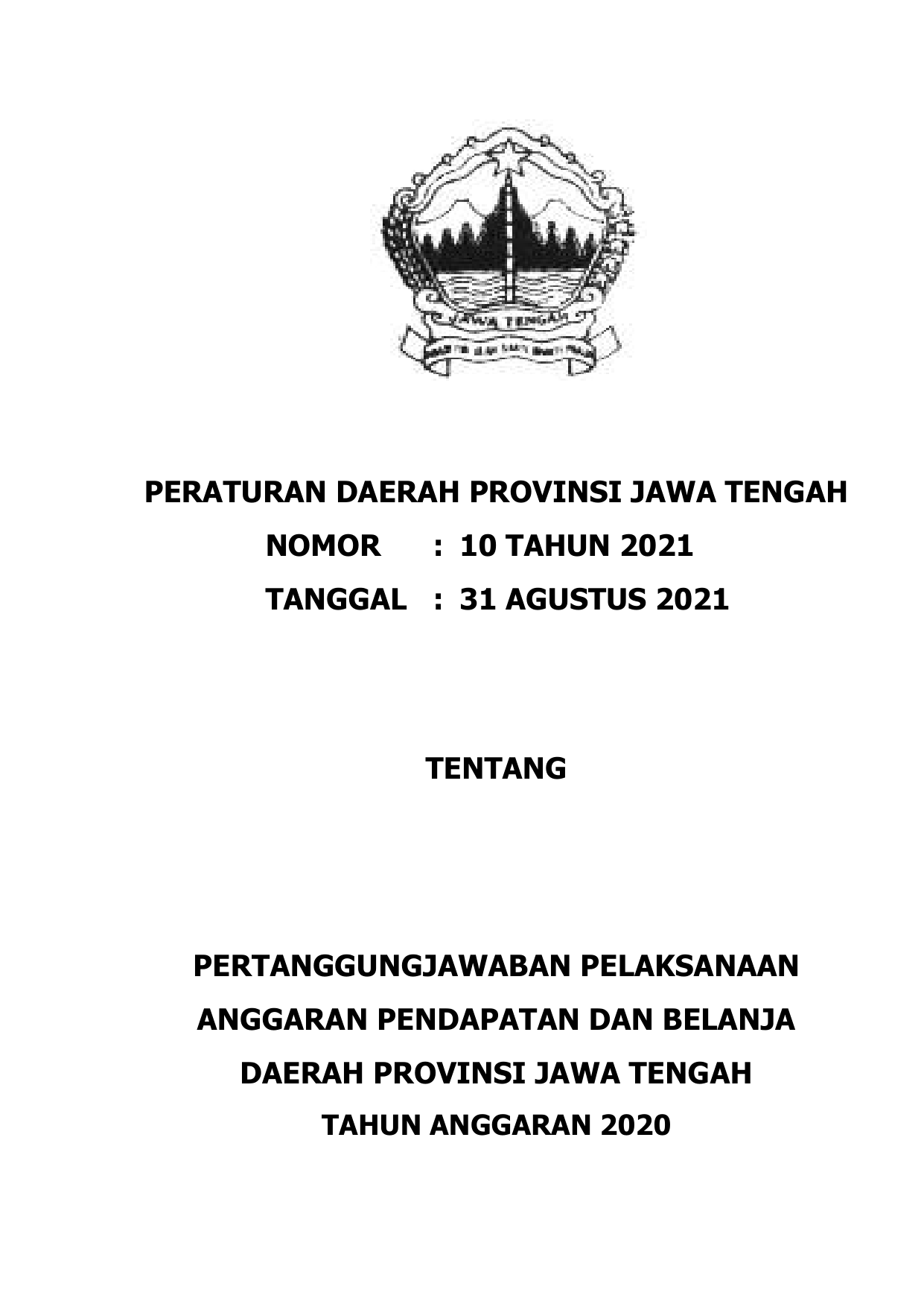PERDA Nomor 10 Tahun 2021 | Peraturan Daerah Nomor 10 Tahun 2021 tentang PERTANGGUNGJAWABAN PELAKSANAAN ANGGARAN PENDAPATAN DAN BELANJA DAERAH PROVINSI JAWA TENGAH TAHUN ANGGARAN 2020