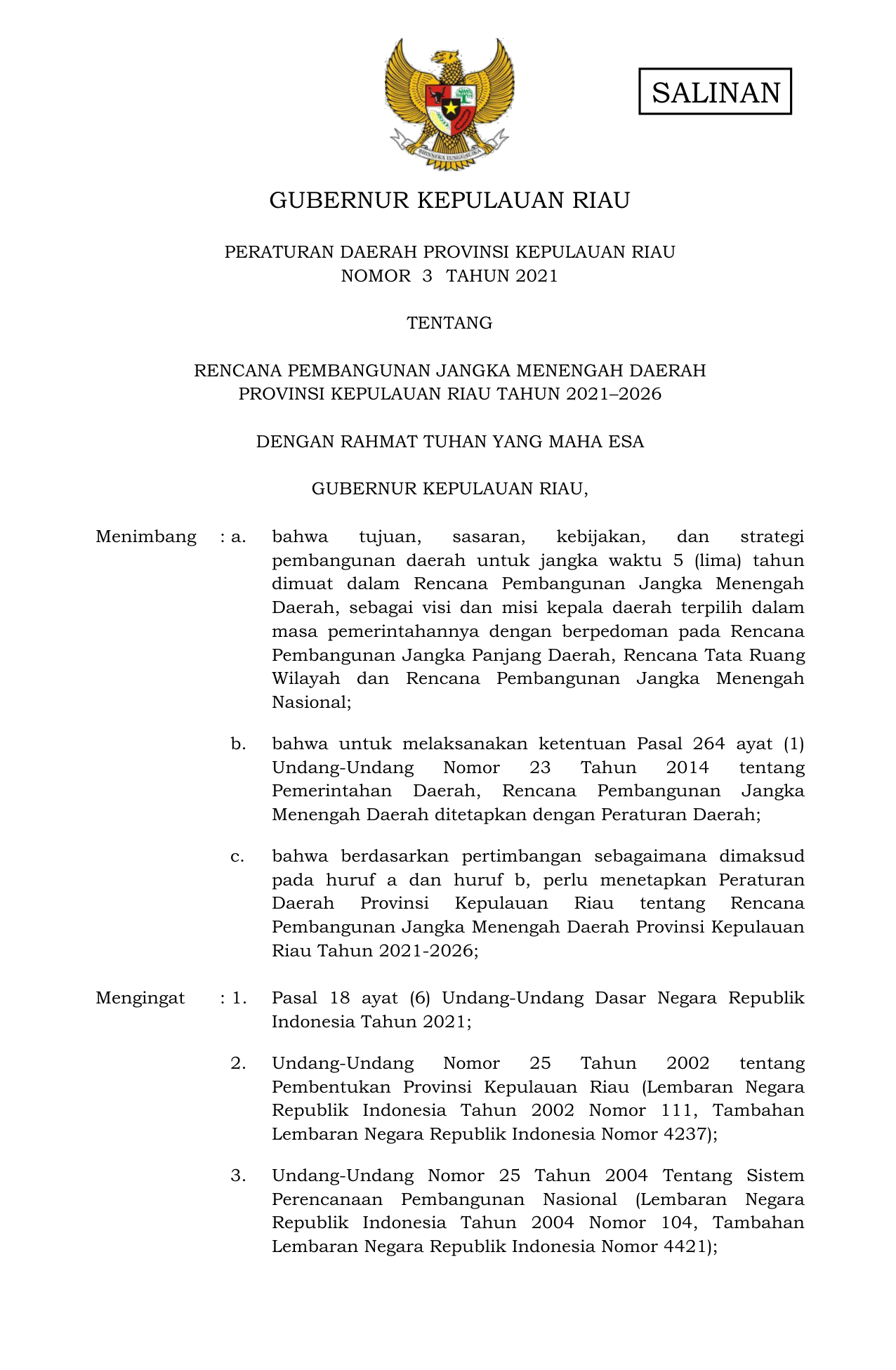 PERDA Nomor 3 Tahun 2021 | Peraturan Daerah Nomor 3 Tahun 2021 tentang RENCANA PEMBANGUNAN JANGKA MENENGAH DAERAH PROVINSI KEPULAUAN RIAU TAHUN 2021–2026