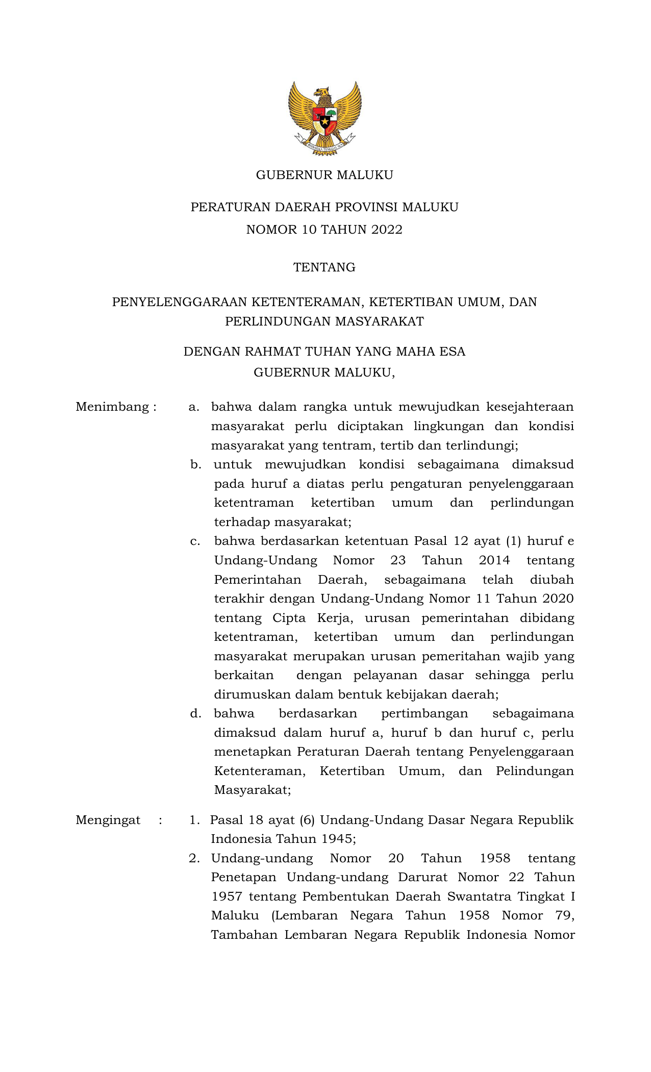 PERDA Nomor 10 Tahun 2022 | Peraturan Daerah Nomor 10 Tahun 2022 tentang PENYELENGGARAAN KETENTERAMAN, KETERTIBAN UMUM, DAN PERLINDUNGAN MASYARAKAT
