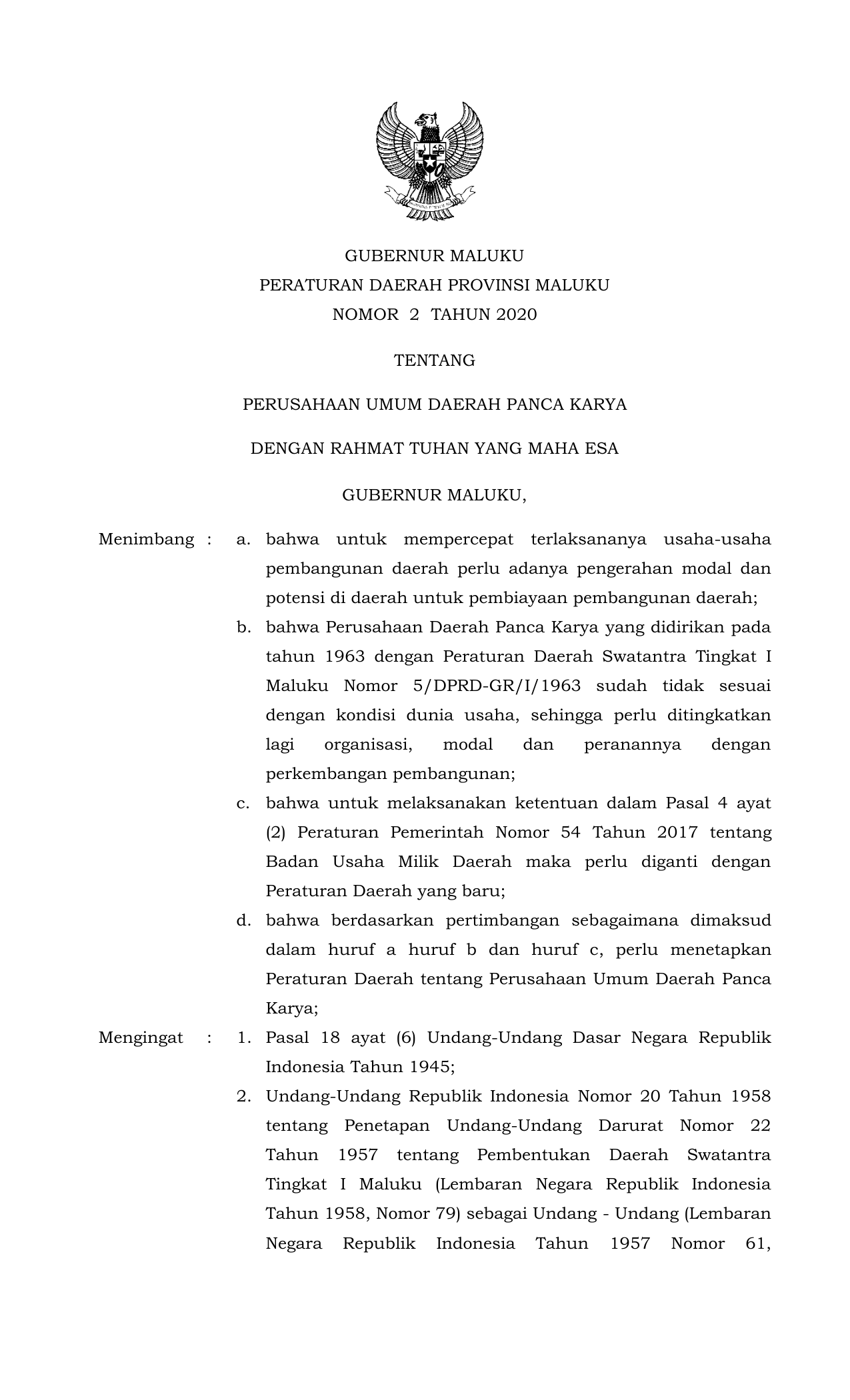 PERDA Nomor 2 Tahun 2020 | Peraturan Daerah Nomor 2 Tahun 2020 tentang PENYERTAAN MODAL DAERAH KEPADA PERUSAHAAN UMUM DAERAH PANCA KARYA