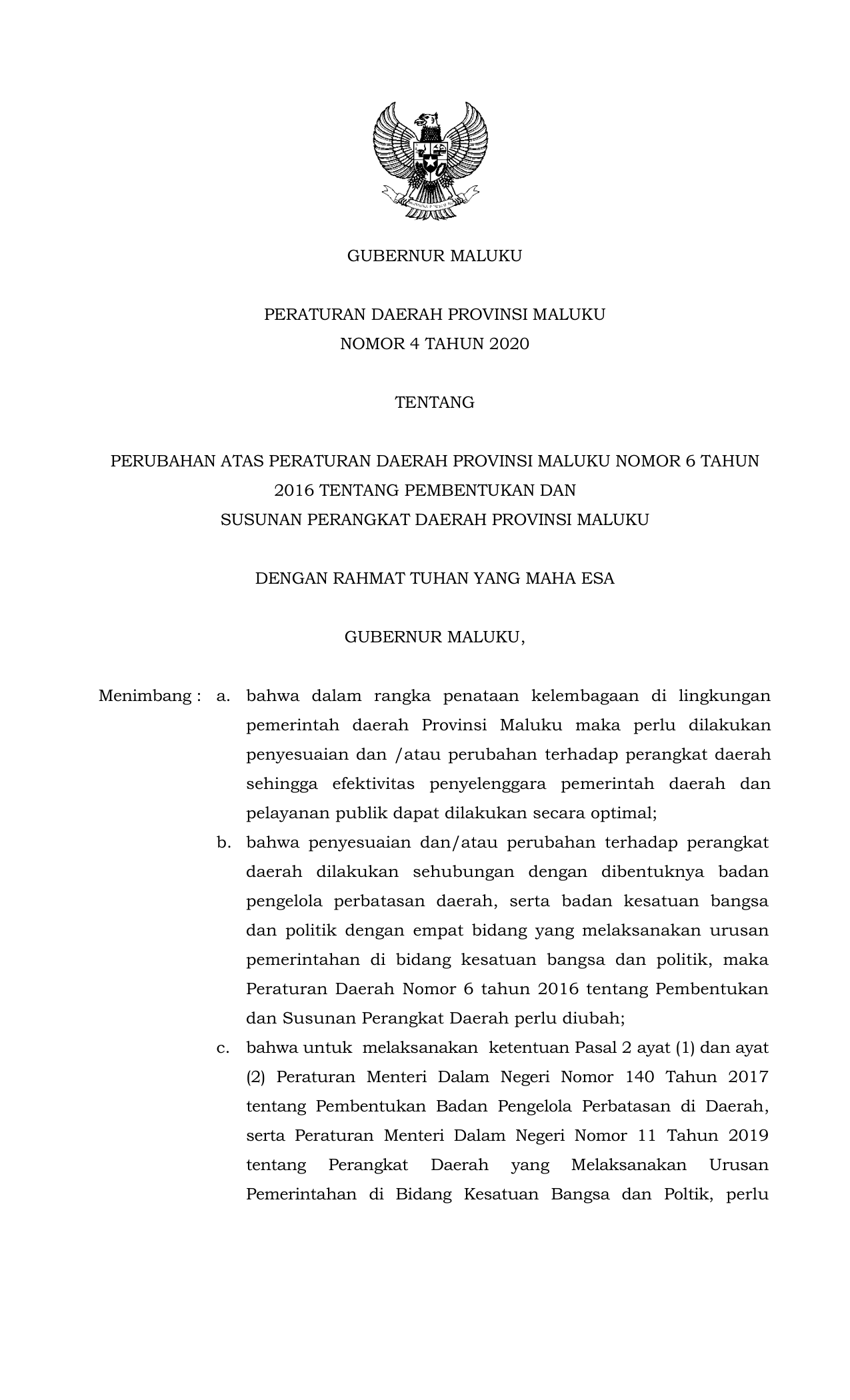 PERDA Nomor 4 Tahun 2020 | Peraturan Daerah Nomor 4 Tahun 2020 tentang PERUBAHAN ATAS PERATURAN DAERAH PROVINSI MALUKU NOMOR 6 TAHUN 2016 TENTANG PEMBENTUKAN DAN SUSUNAN PERANGKAT DAERAH PROVINSI MALUKU