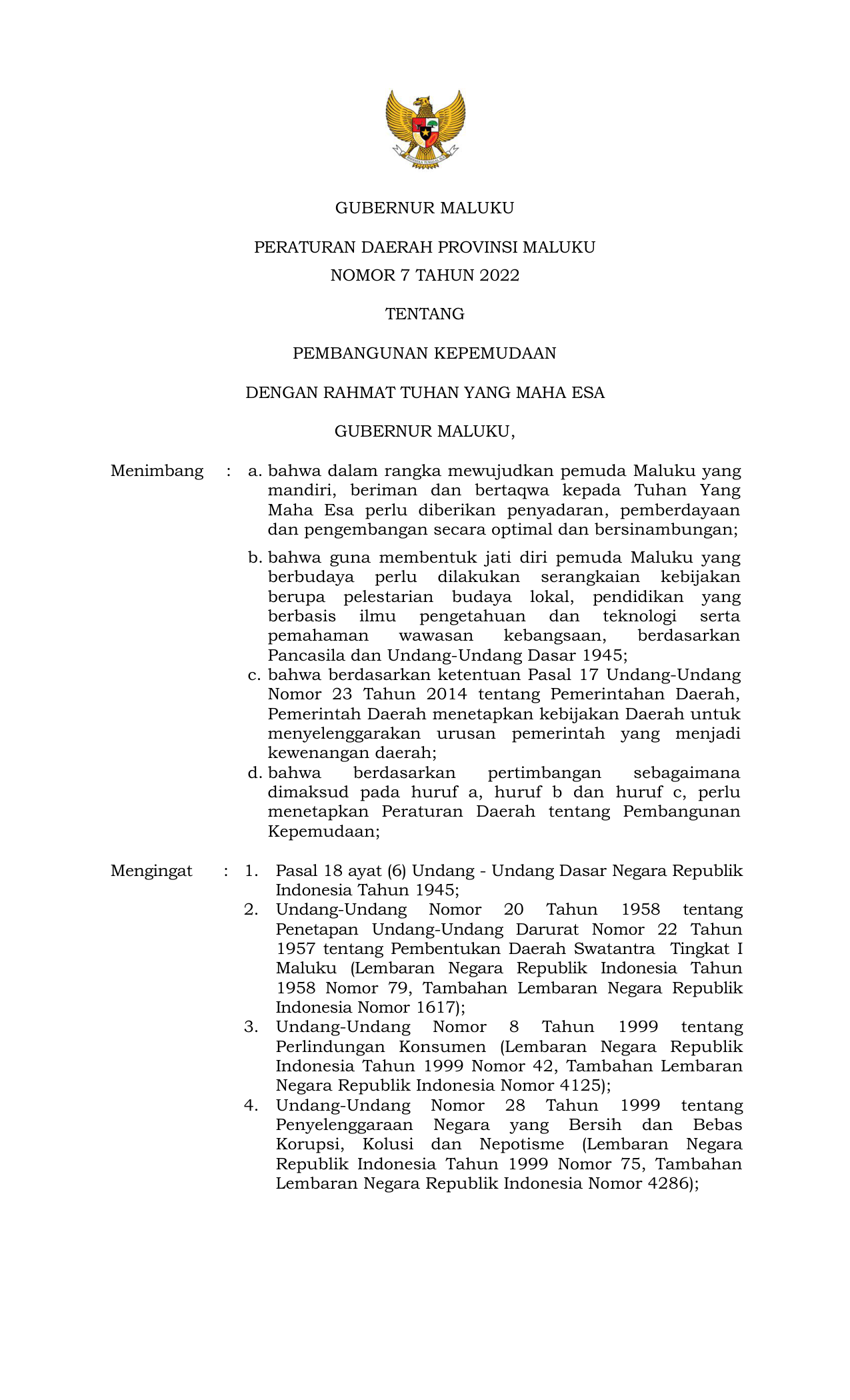 PERDA Nomor 7 Tahun 2022 | Peraturan Daerah Nomor 7 Tahun 2022 tentang PEMBANGUNAN KEPEMUDAAN