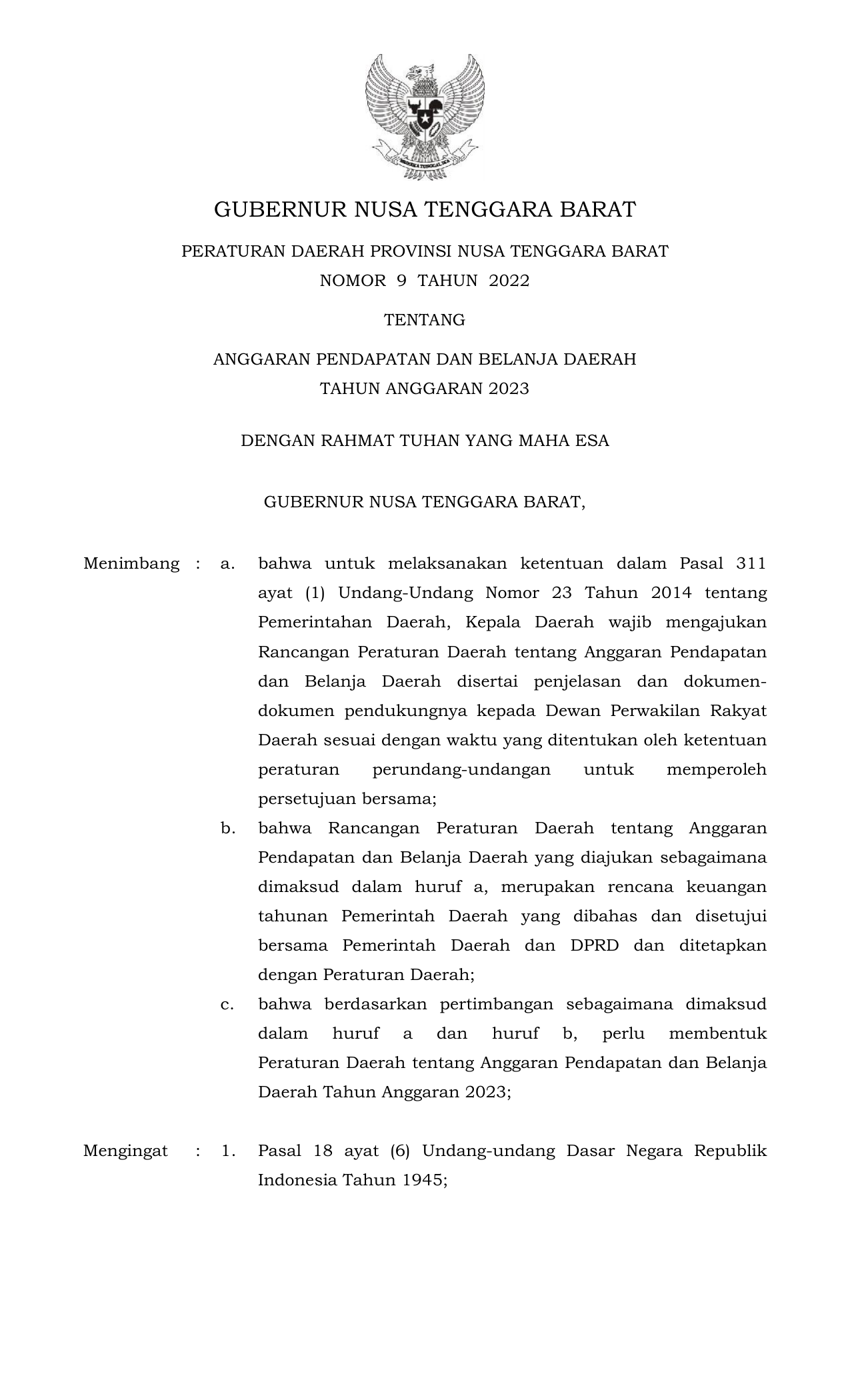 Gubernur MENETAPKAN Peraturan Gubernur tentang penjabaran APBD Provinsi Nusa Tenggara Barat Tahun Anggaran 2023 sebagai landasan operasional pelaksanaan APBD Tahun Anggaran 2023.