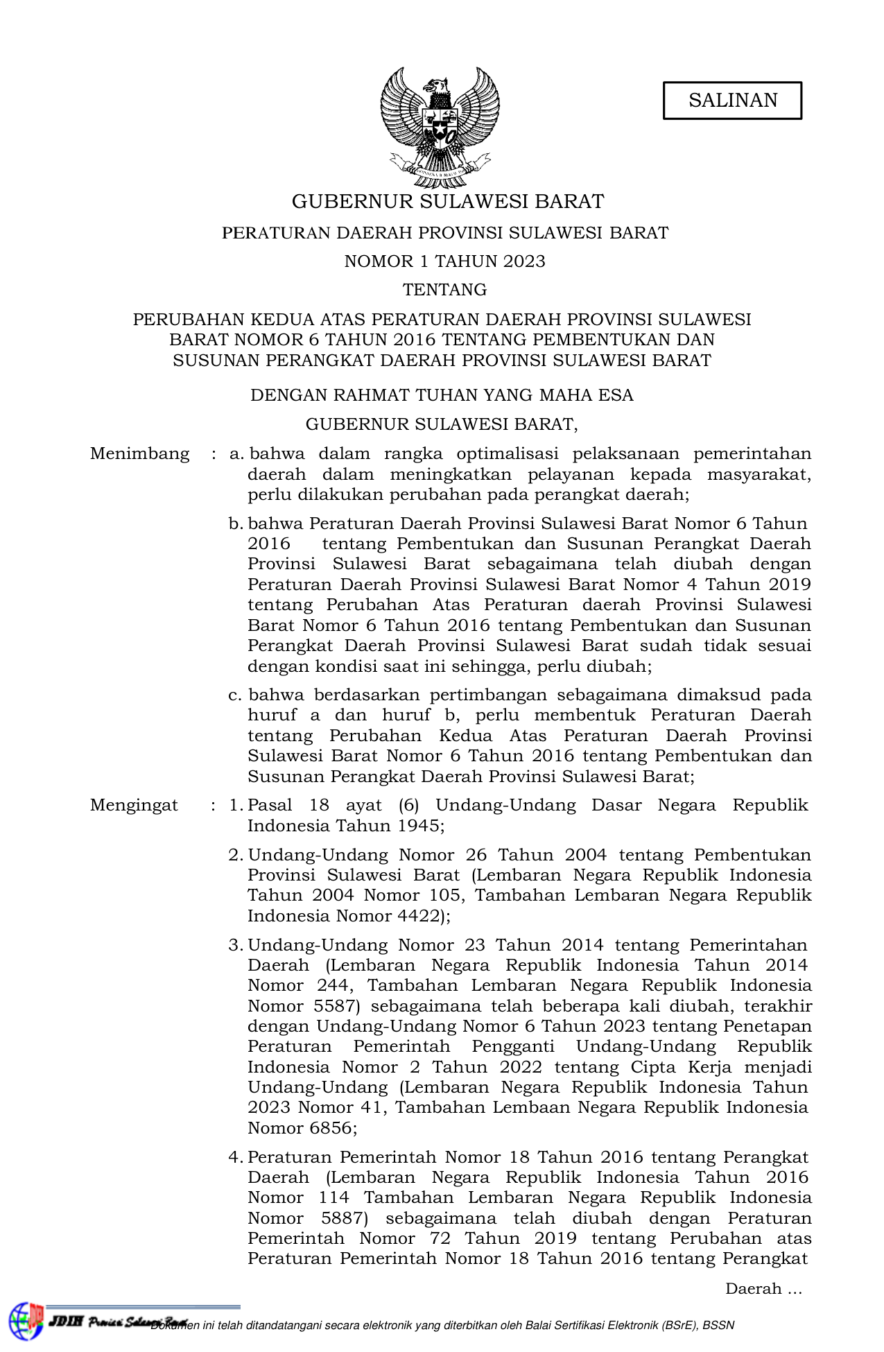 PERDA Nomor 1 Tahun 2023 | Peraturan Daerah Nomor 1 Tahun 2023 tentang PERUBAHAN KEDUA ATAS PERATURAN DAERAH PROVINSI SULAWESI BARAT NOMOR 6 TAHUN 2016 TENTANG PEMBENTUKAN DAN SUSUNAN PERANGKAT DAERAH PROVINSI SULAWESI BARAT