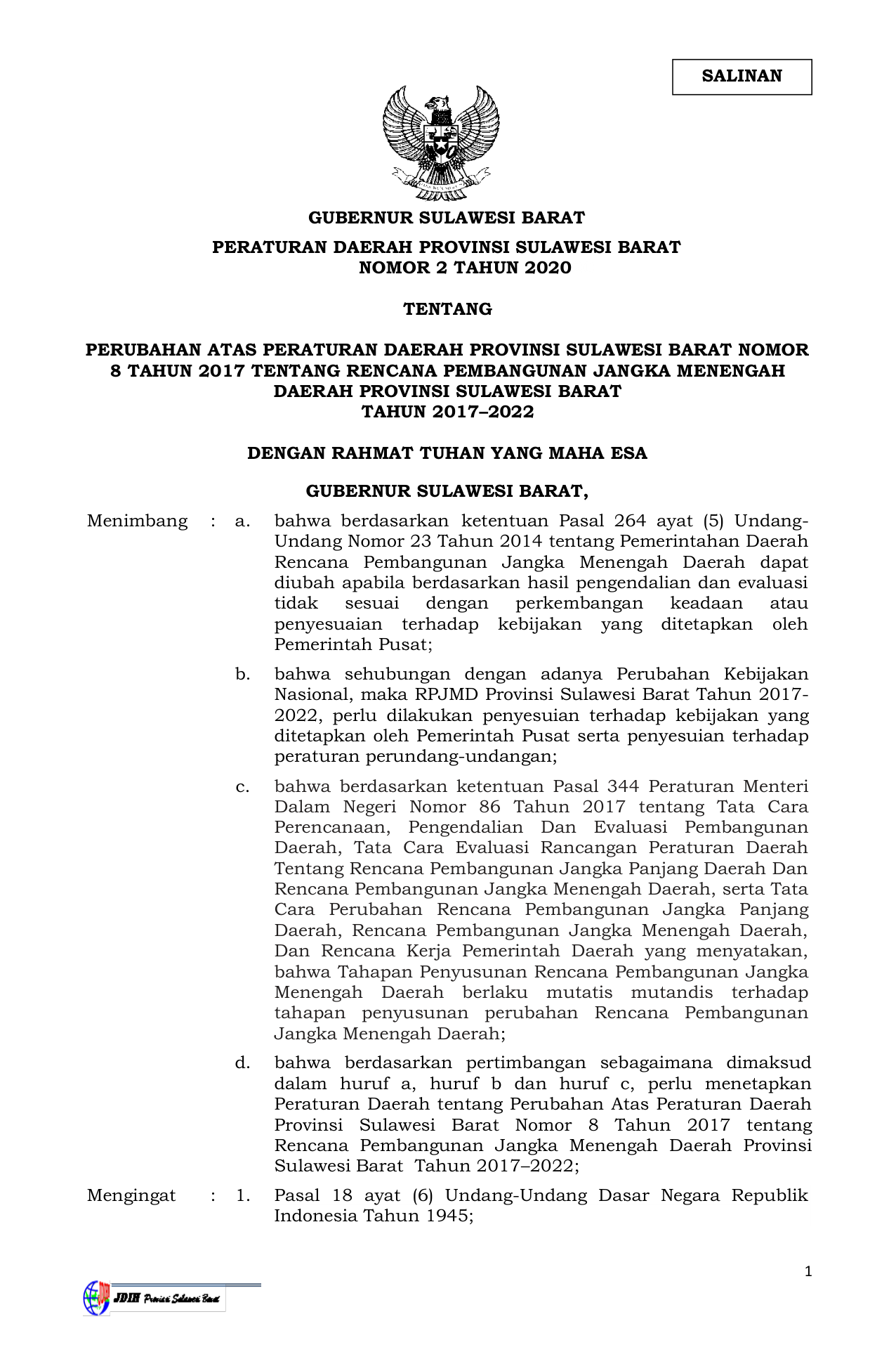 PERDA Nomor 2 Tahun 2020 | Peraturan Daerah Nomor 2 Tahun 2020 tentang PERUBAHAN ATAS PERATURAN DAERAH PROVINSI SULAWESI BARAT NOMOR 8 TAHUN 2017 TENTANG RENCANA PEMBANGUNAN JANGKA MENENGAH DAERAH PROVINSI SULAWESI BARAT TAHUN 2017–2022