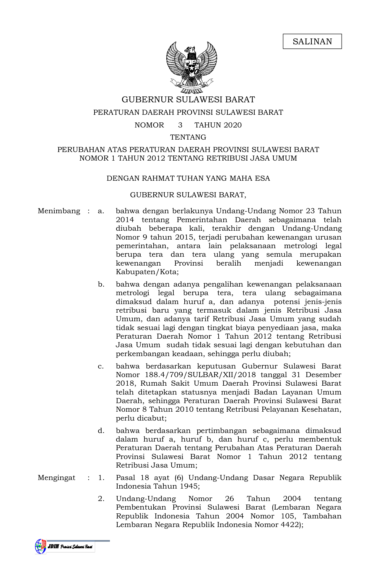 PERDA Nomor 3 Tahun 2020 | Peraturan Daerah Nomor 3 Tahun 2020 tentang PERUBAHAN ATAS PERATURAN DAERAH PROVINSI SULAWESI BARAT NOMOR 1 TAHUN 2012 TENTANG RETRIBUSI JASA UMUM