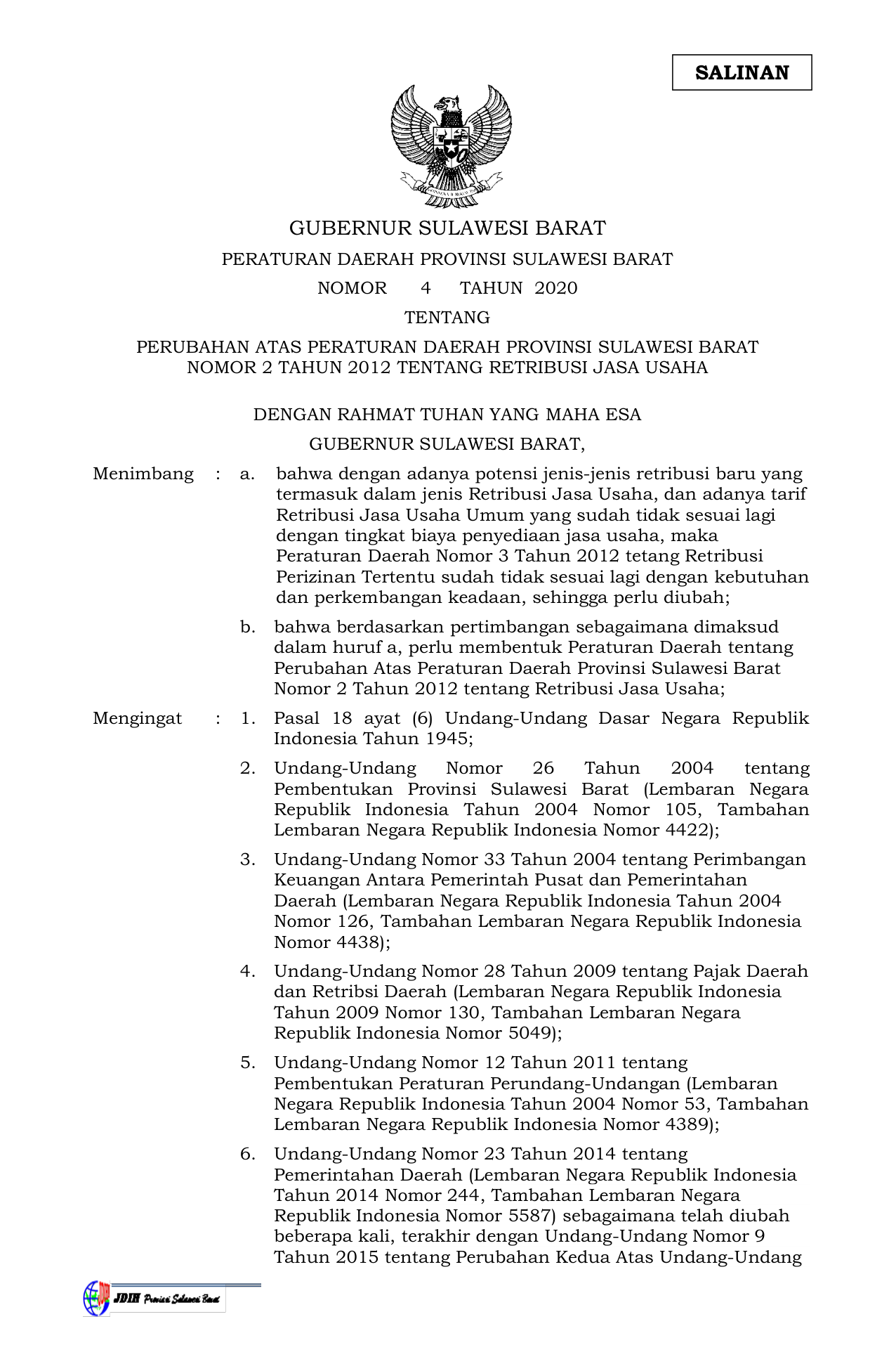 PERDA Nomor 4 Tahun 2020 | Peraturan Daerah Nomor 4 Tahun 2020 tentang PERUBAHAN ATAS PERATURAN DAERAH PROVINSI SULAWESI BARAT NOMOR 2 TAHUN 2012 TENTANG RETRIBUSI JASA USAHA