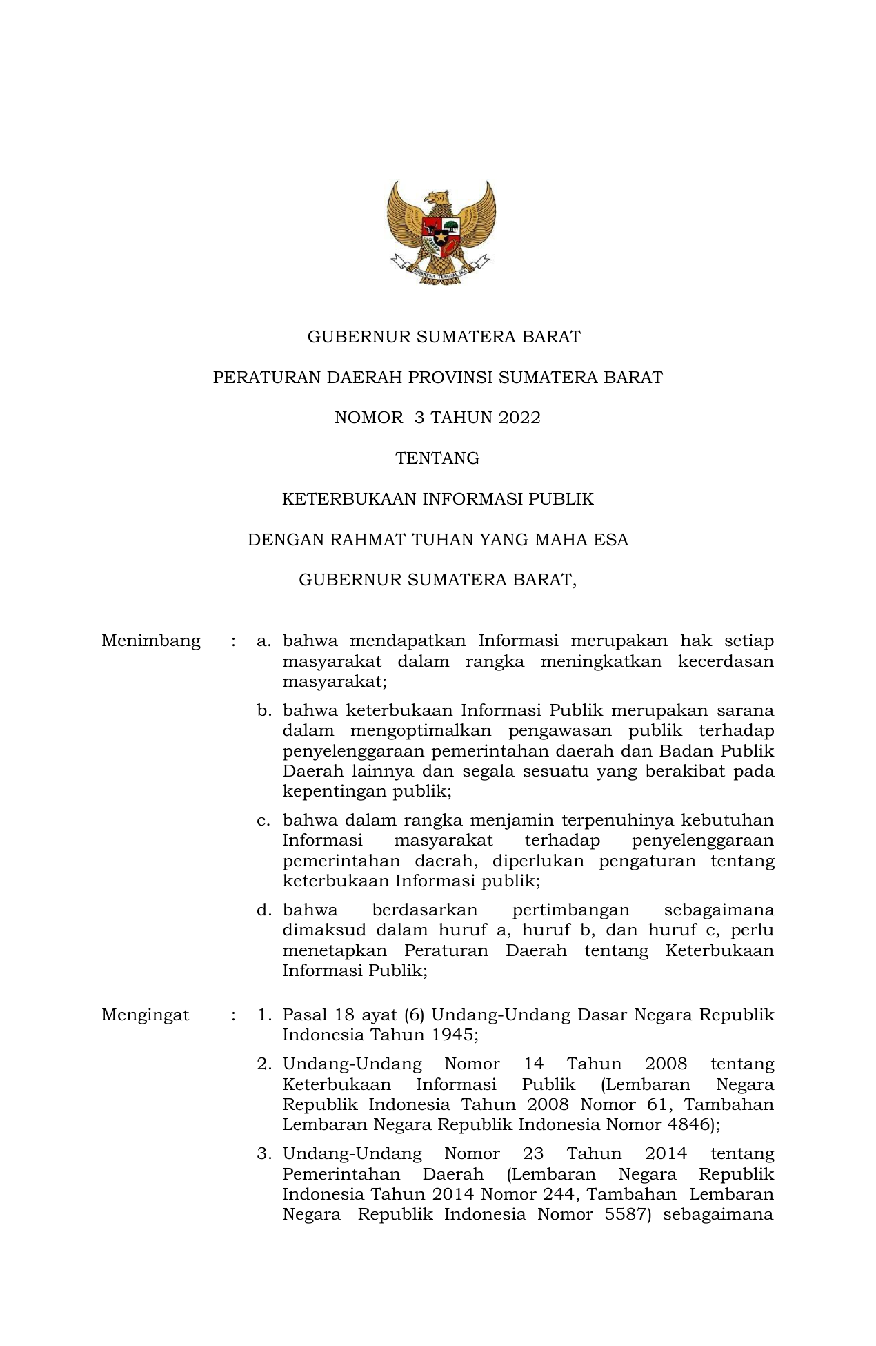 PERDA Nomor 3 Tahun 2022 | Peraturan Daerah Nomor 3 Tahun 2022 tentang KETERBUKAAN INFORMASI PUBLIK