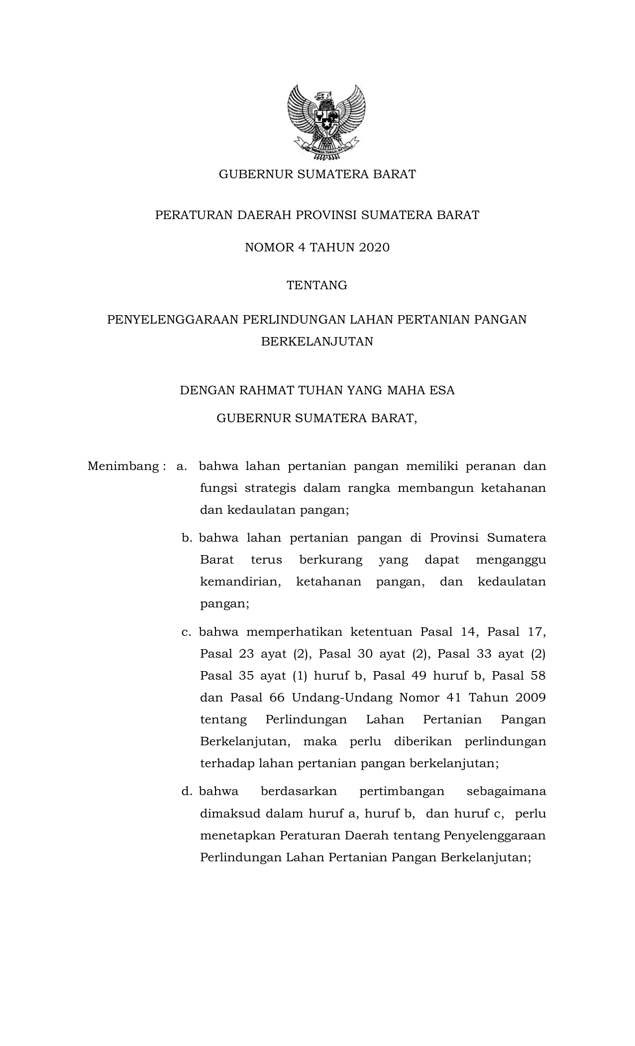PERDA Nomor 4 Tahun 2020 | Peraturan Daerah Nomor 4 Tahun 2020 tentang PENYELENGGARAAN PERLINDUNGAN LAHAN PERTANIAN PANGAN BERKELANJUTAN