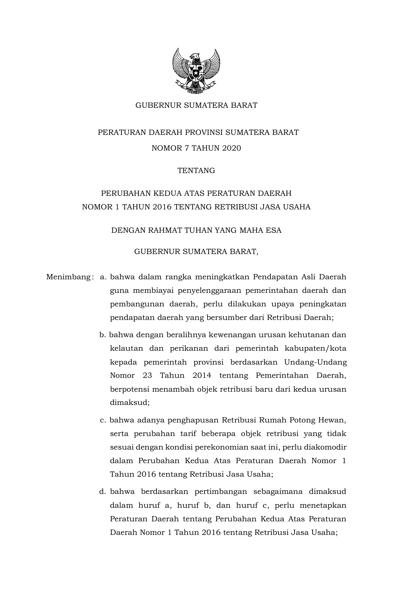 PERDA Nomor 7 Tahun 2020 | Peraturan Daerah Nomor 7 Tahun 2020 tentang PERUBAHAN KEDUA ATAS PERATURAN DAERAH NOMOR 1 TAHUN 2016 TENTANG RETRIBUSI JASA USAHA