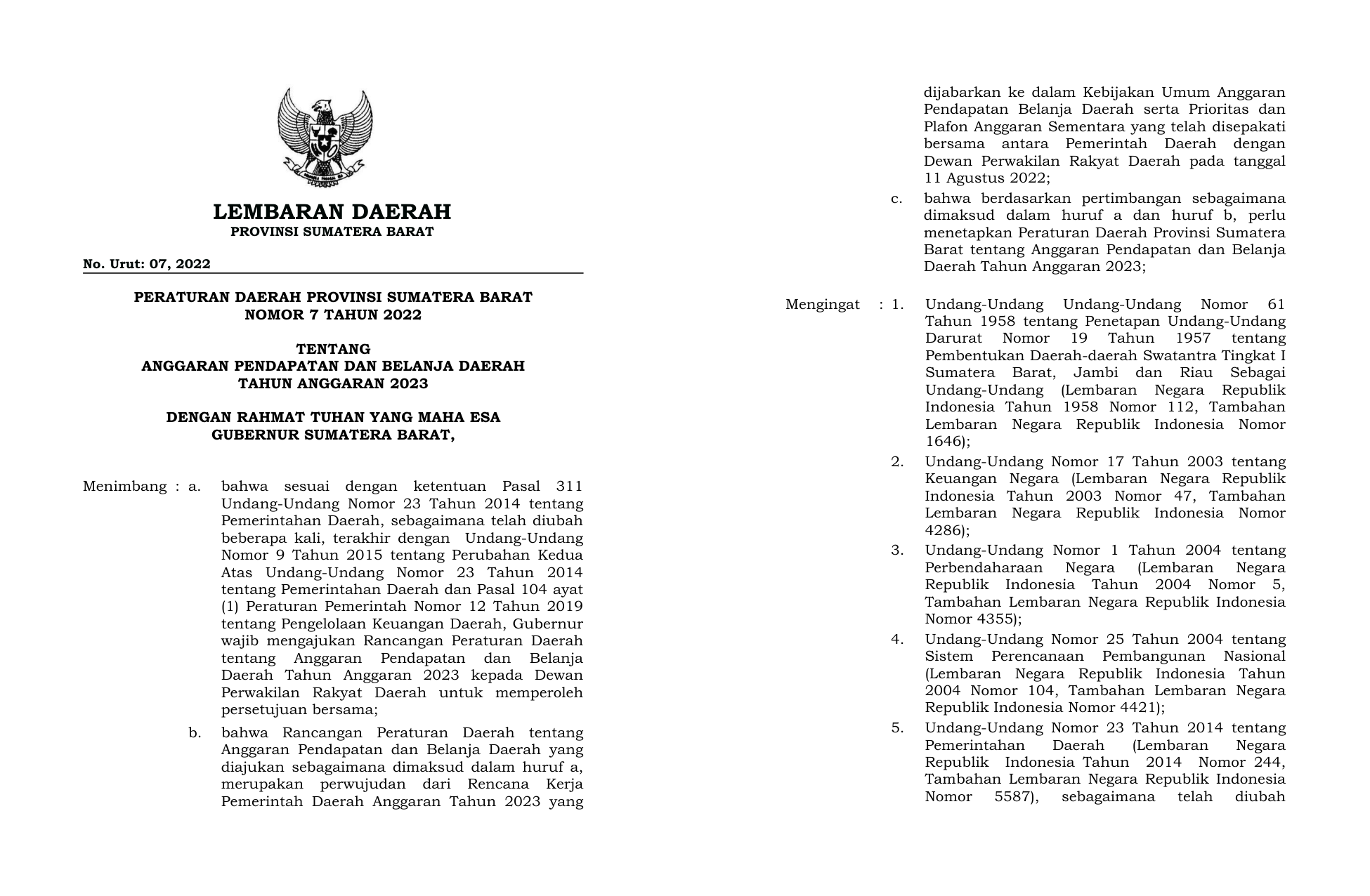 PERDA Nomor 7 Tahun 2022 | Peraturan Daerah Nomor 7 Tahun 2022 tentang ANGGARAN PENDAPATAN DAN BELANJA DAERAH TAHUN ANGGARAN 2023