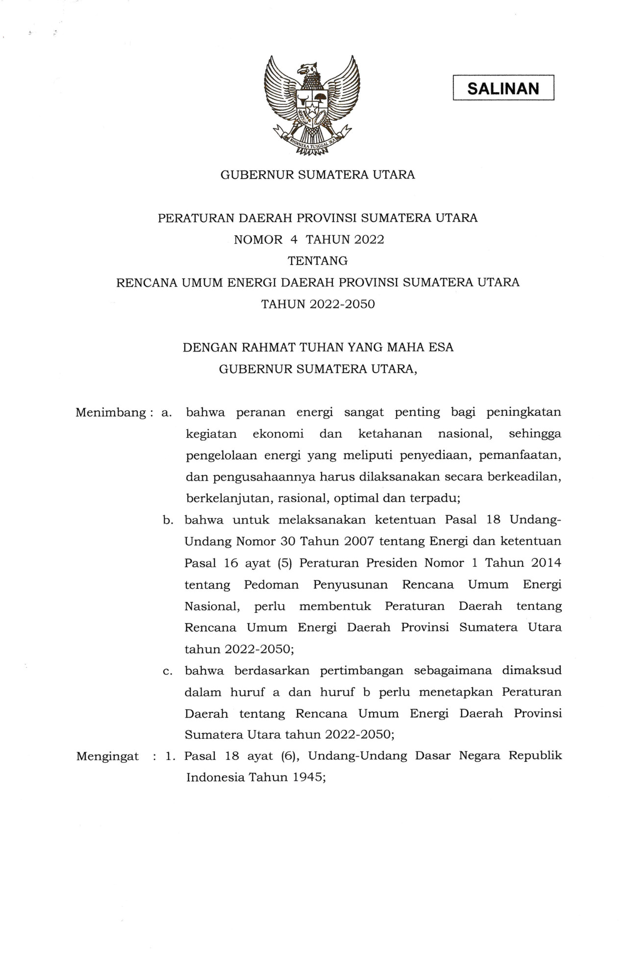 PERDA Nomor 4 Tahun 2022 | Peraturan Daerah Nomor 4 Tahun 2022 tentang Peraturan Daerah Sumatera Utara Nomor 4 Tahun 2022 tentang Rencana Umum Energi Daerah Provinsi Sumatera Utara Tahun 2022-2050