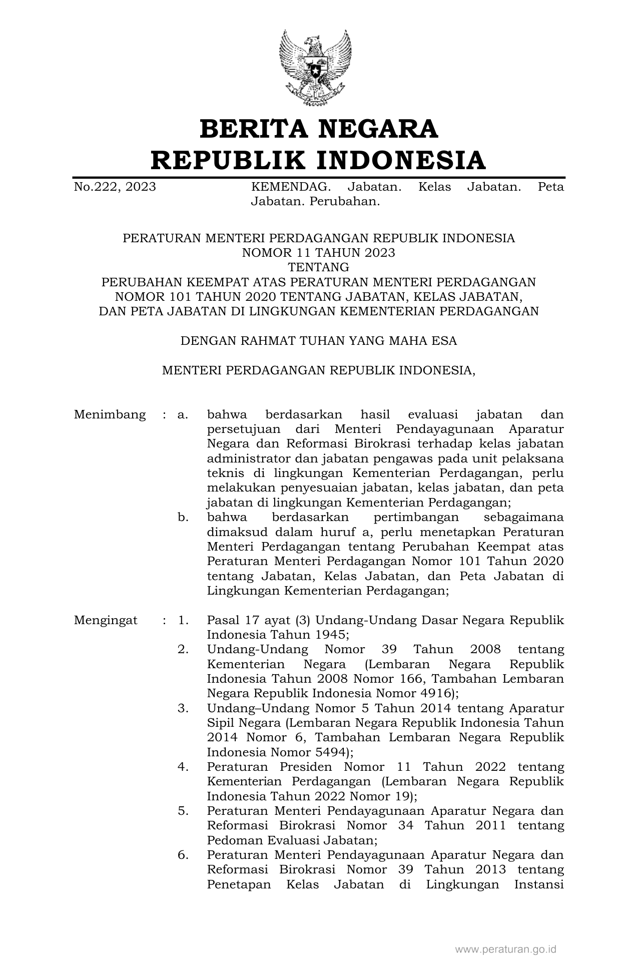 PERMEN Nomor 11 Tahun 2023 | Peraturan Menteri Nomor 11 Tahun 2023 tentang PERUBAHAN KEEMPAT ATAS PERATURAN MENTERI PERDAGANGAN NOMOR 101 TAHUN 2020 TENTANG JABATAN, KELAS JABATAN, DAN PETA JABATAN DI LINGKUNGAN KEMENTERIAN PERDAGANGAN