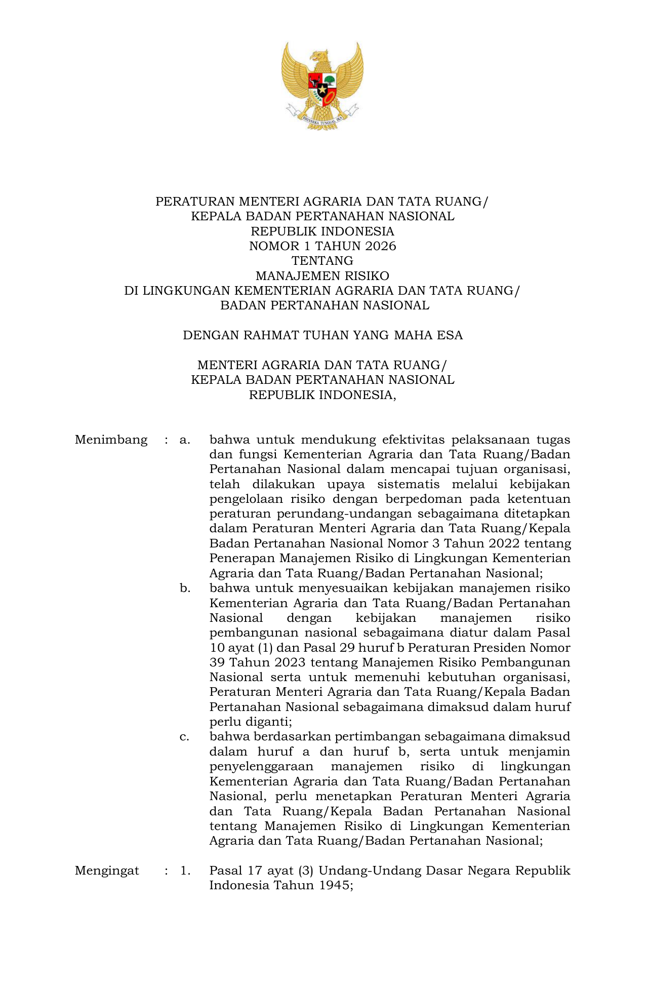 PERMEN Nomor 1 Tahun 2026 | Peraturan Menteri Nomor 1 Tahun 2026 tentang Manajemen Risiko Di Lingkungan Kementerian Agraria dan Tata Ruang Badan Pertanahan Nasional