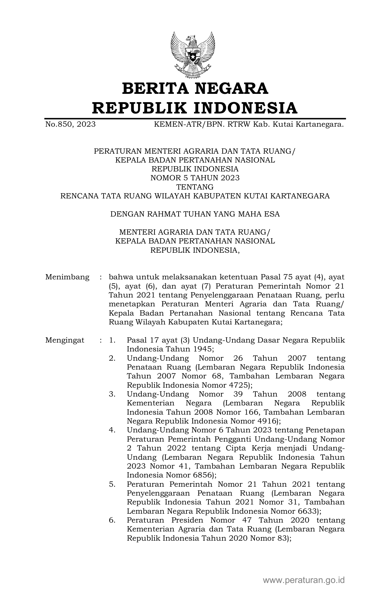 PERMEN Nomor 5 Tahun 2023 | Peraturan Menteri Nomor 5 Tahun 2023 tentang RENCANA TATA RUANG WILAYAH KABUPATEN KUTAI KARTANEGARA