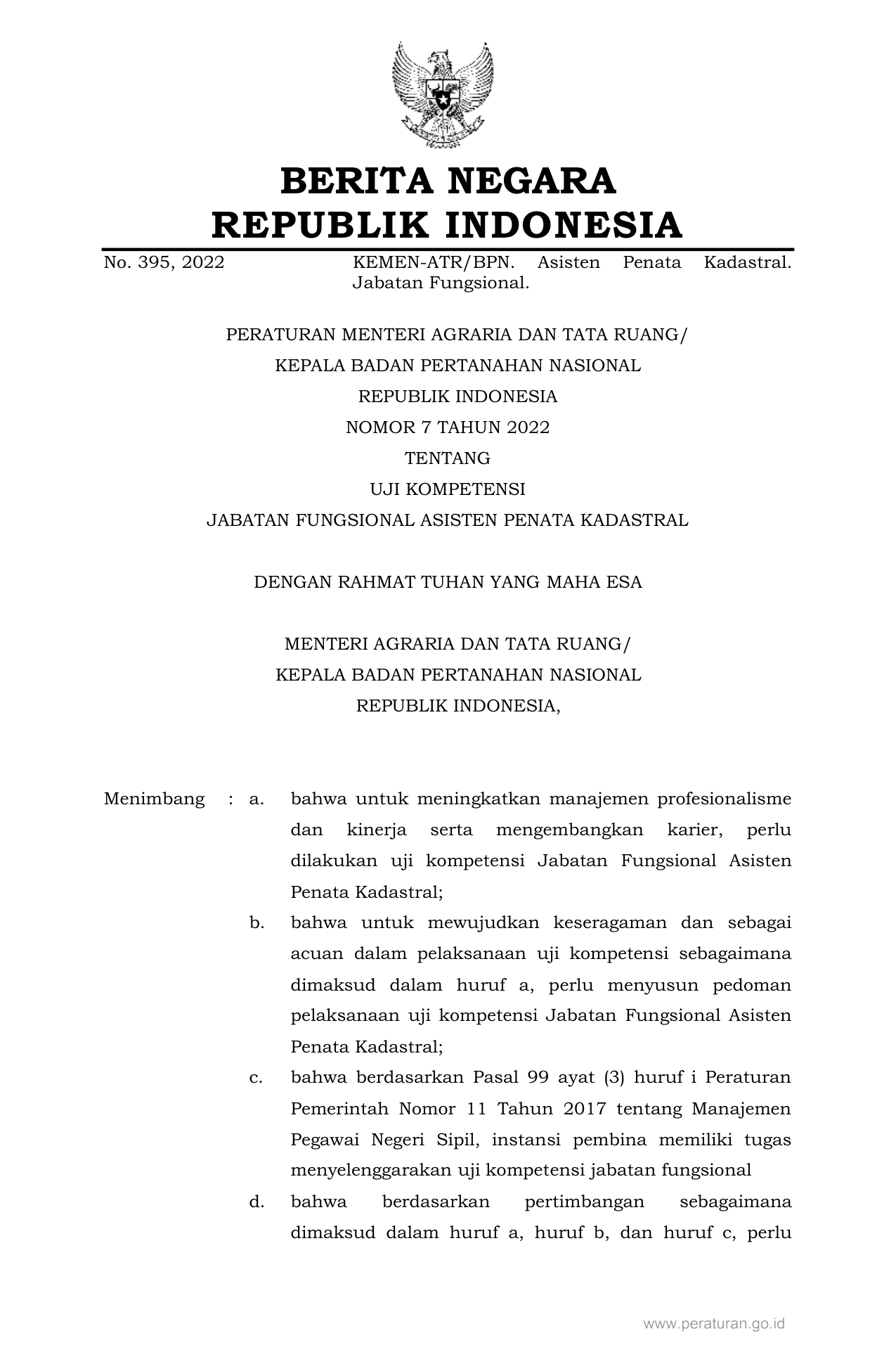 PERMEN Nomor 7 Tahun 2022 | Peraturan Menteri Nomor 7 Tahun 2022 tentang UJI KOMPETENSI JABATAN FUNGSIONAL ASISTEN PENATA KADASTRAL