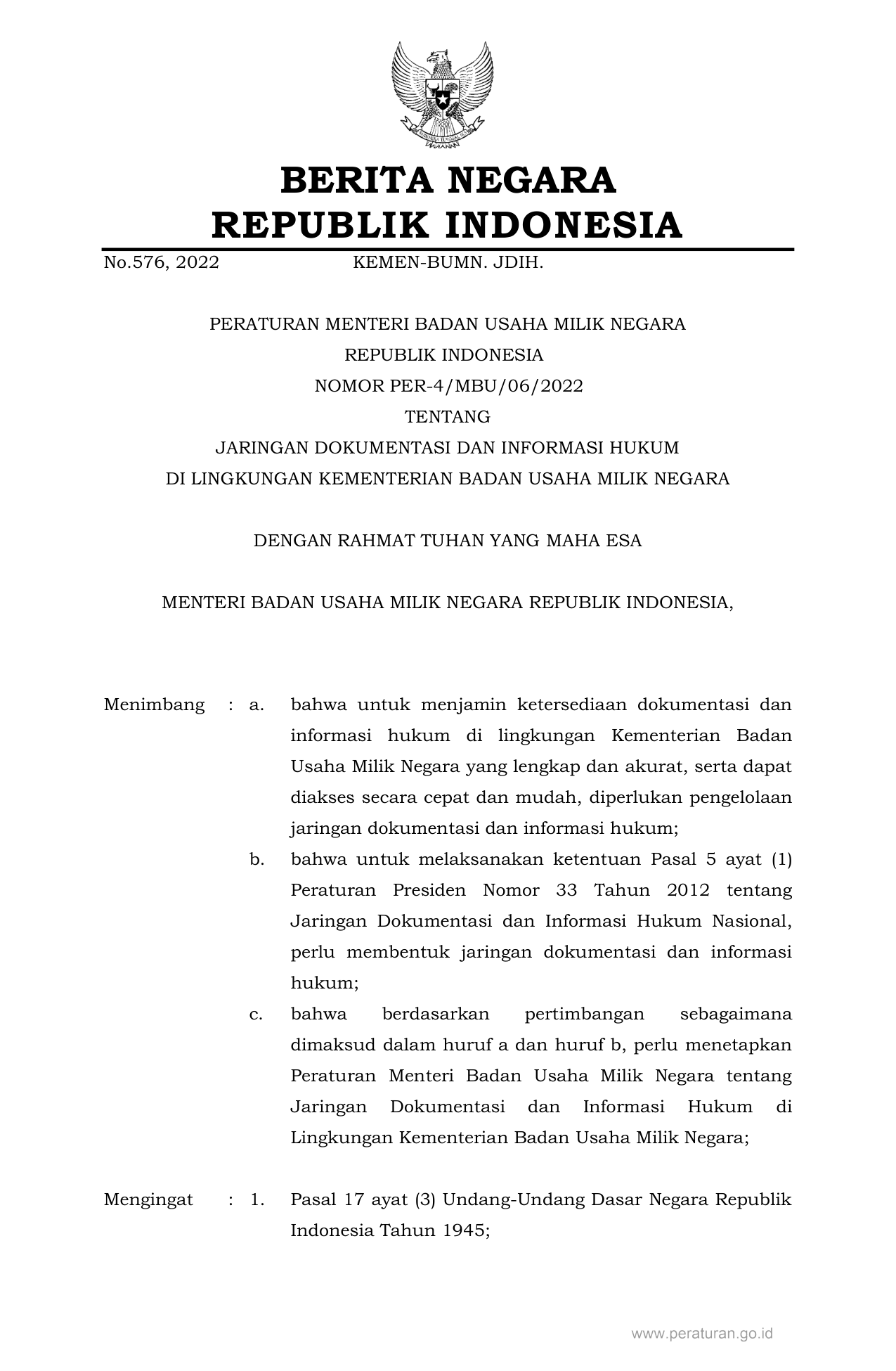 PERMEN Nomor per-4-mbu-06-2022 Tahun 2022 | Peraturan Menteri Nomor per-4-mbu-06-2022 Tahun 2022 tentang JARINGAN DOKUMENTASI DAN INFORMASI HUKUM DI LINGKUNGAN KEMENTERIAN BADAN USAHA MILIK NEGARA