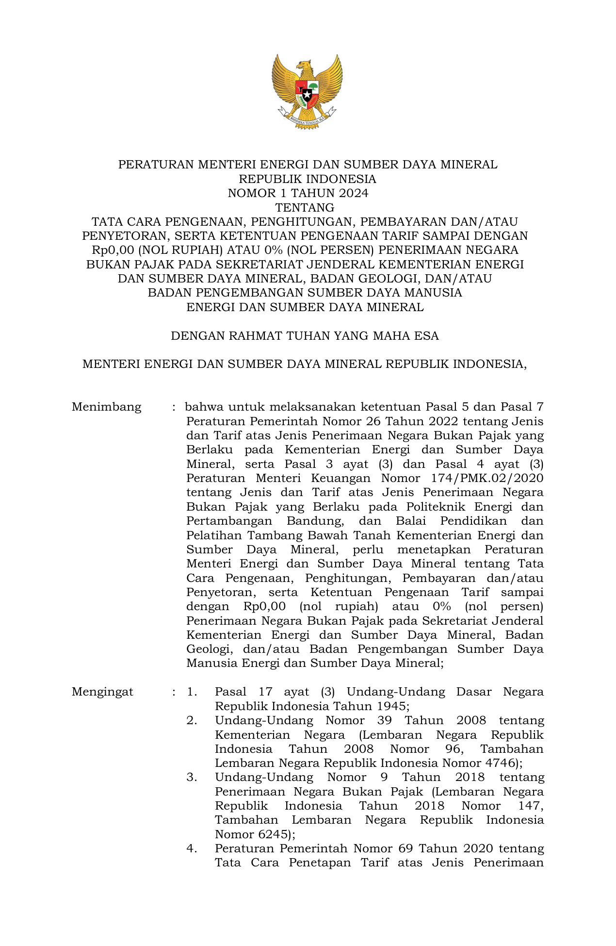 PERMEN Nomor 1 Tahun 2024 | Peraturan Menteri Nomor 1 Tahun 2024 tentang TATA CARA PENGENAAN, PENGHITUNGAN, PEMBAYARAN DAN/ATAU PENYETORAN, SERTA KETENTUAN PENGENAAN TARIF SAMPAI DENGAN Rp0,00 (NOL RUPIAH) ATAU 0% (NOL PERSEN) PENERIMAAN NEGARA BUKAN PAJAK PADA SEKRETARIAT JENDERAL KEMENTERIAN ENERGI DAN SUMBER DAYA MINERAL, BADAN GEOLOGI, DAN/ATAU BADAN PENGEMBANGAN SUMBER DAYA MANUSIA ENERGI DAN SUMBER DAYA MINERAL