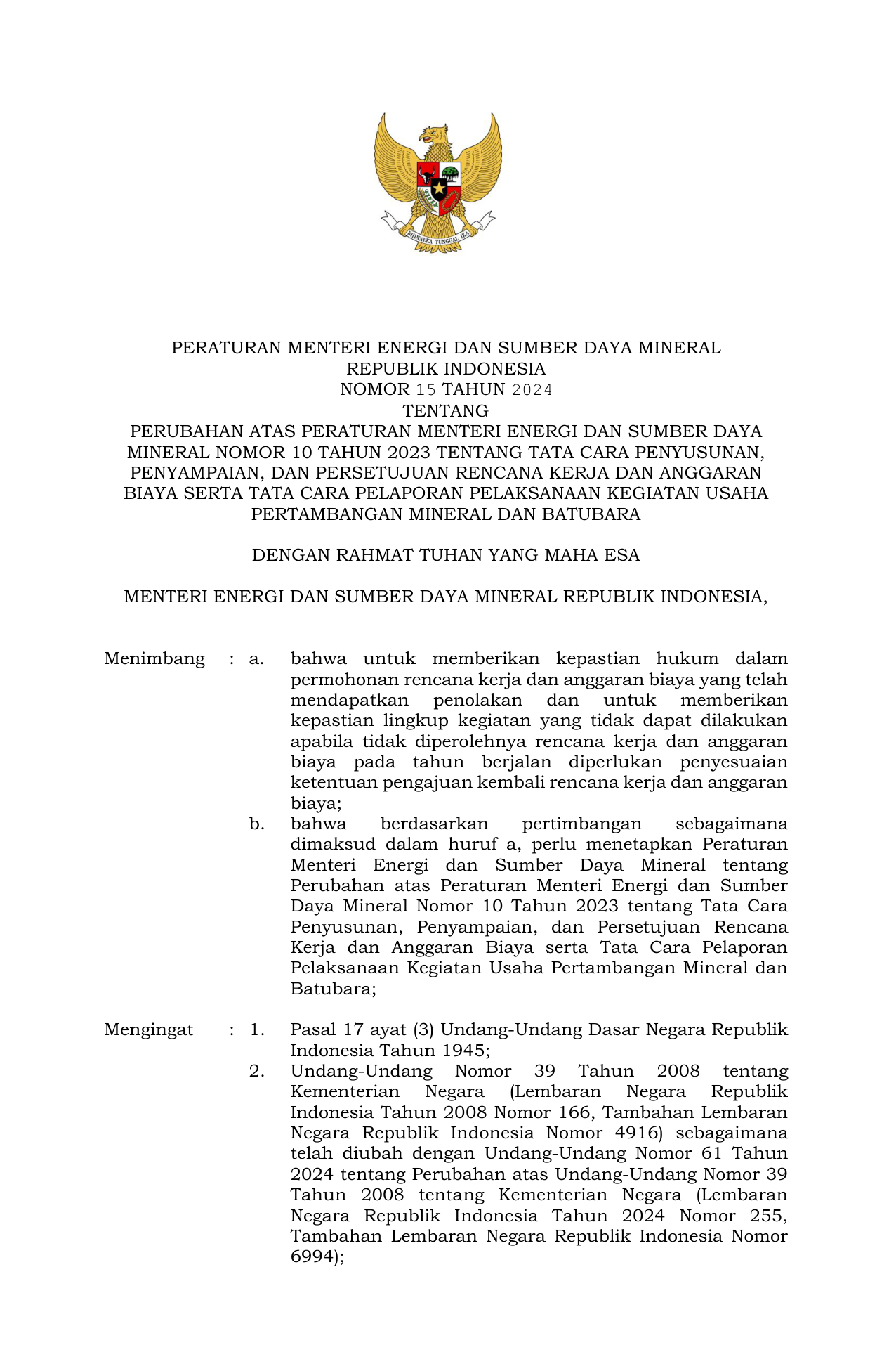 PERMEN Nomor 15 Tahun 2024 | Peraturan Menteri Nomor 15 Tahun 2024 tentang Perubahan atas Peraturan Menteri Energi dan Sumber Daya Mineral Nomor 10 Tahun 2023 tentang Tata Cara Penyusunan, Penyampaian, dan Persetujuan Rencana Kerja dan Anggaran Biaya serta Tata Cara Pelaporan Pelaksanaan Kegiatan Usaha Pertambangan Mineral dan Batubara